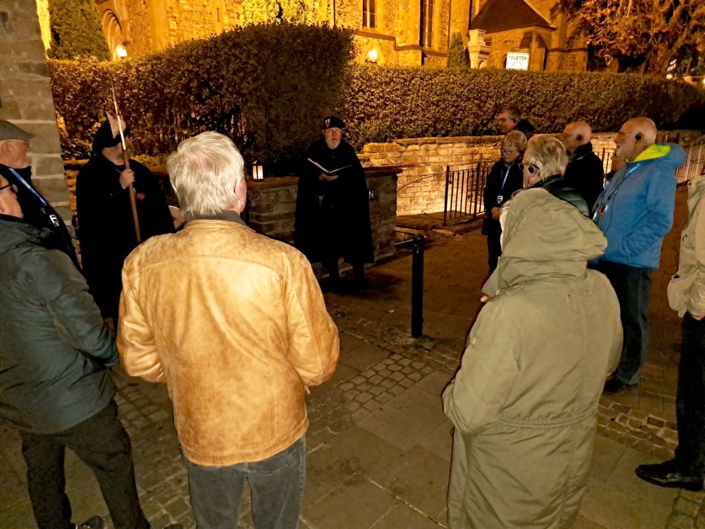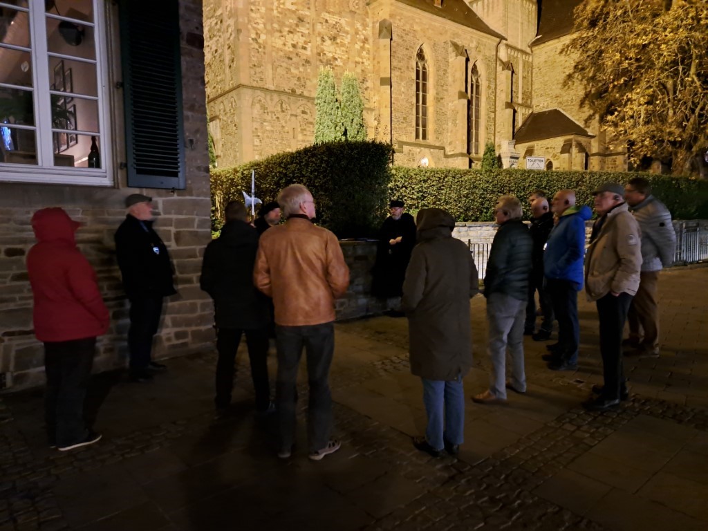 Unsere Nachtwächter Oliver Posberg und Heinz-Werner Blumenkamp empfingen unsere 14-köpfige Gruppe in der damals üblichen Arbeitskleidung (Helm und Umhang; ausgestattet mit Hellebarde, Laterne und Horn) vor der Kirche St. Peter und Paul.