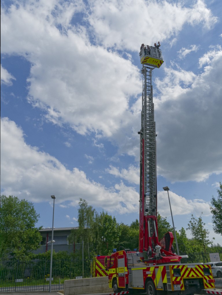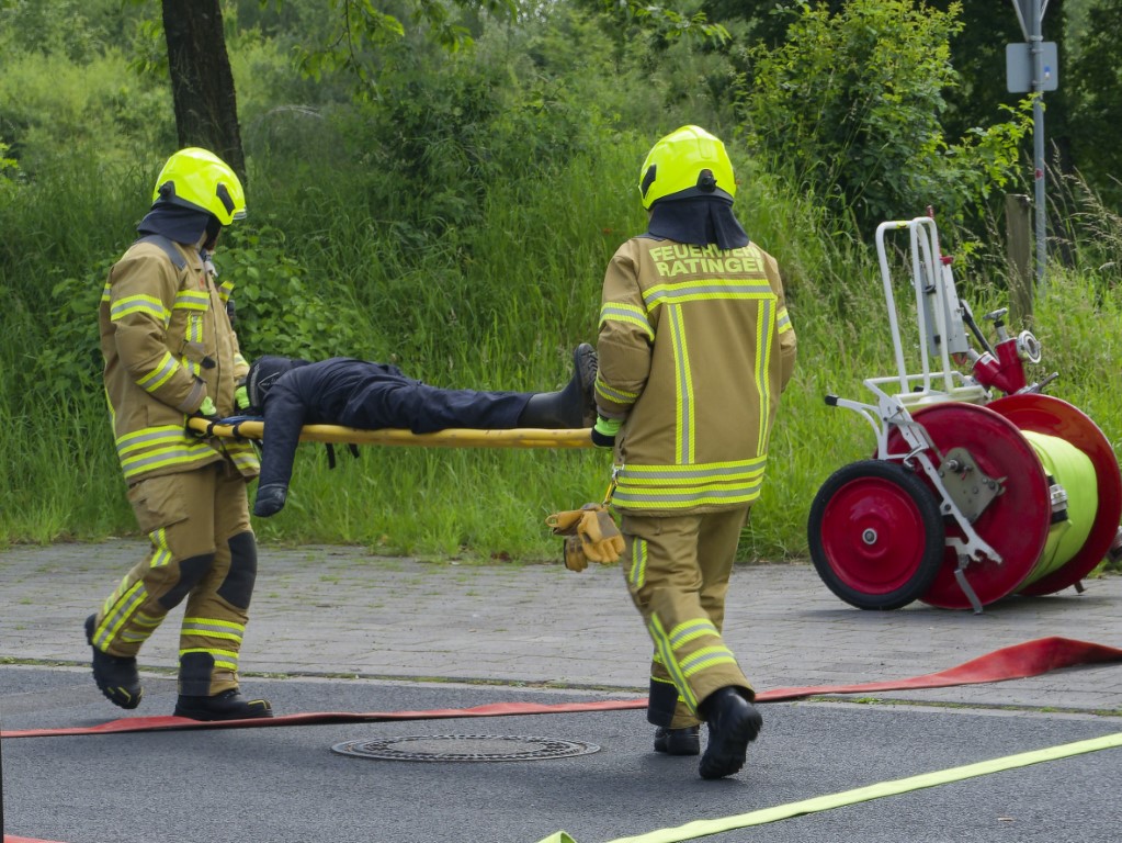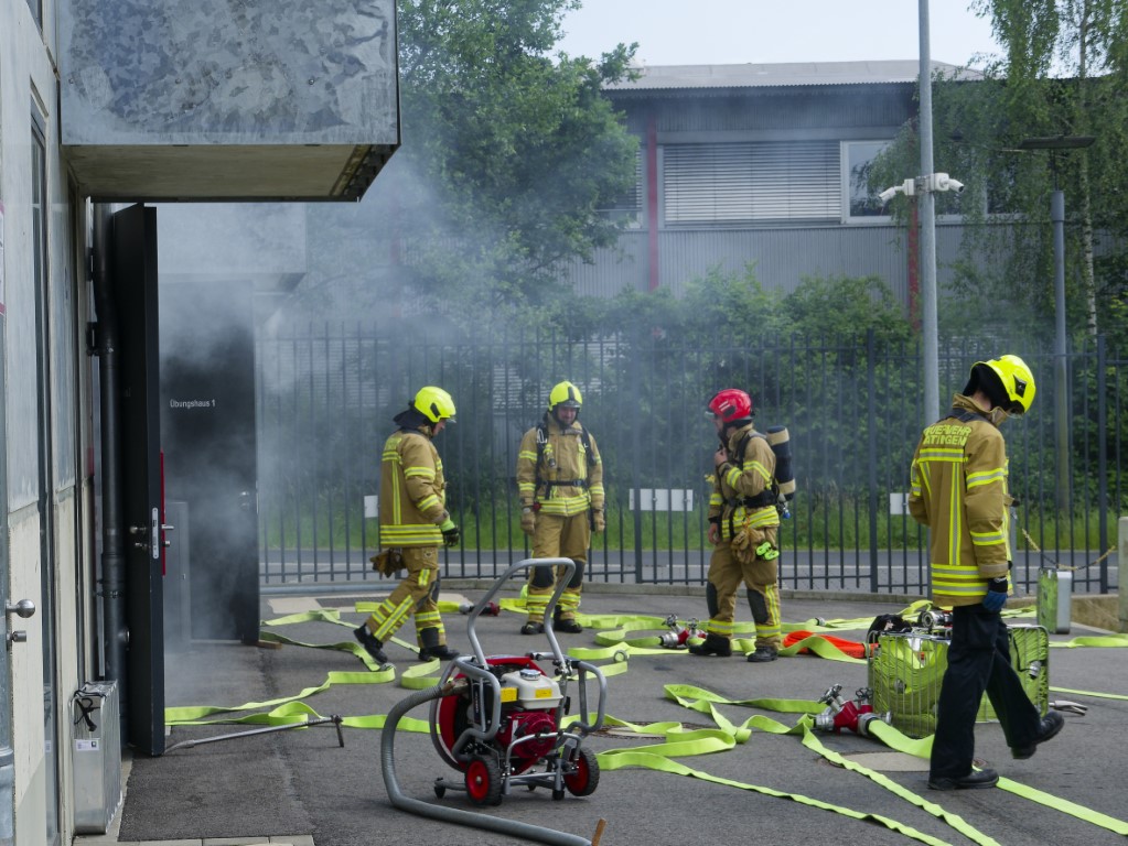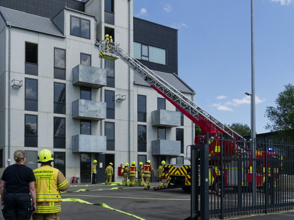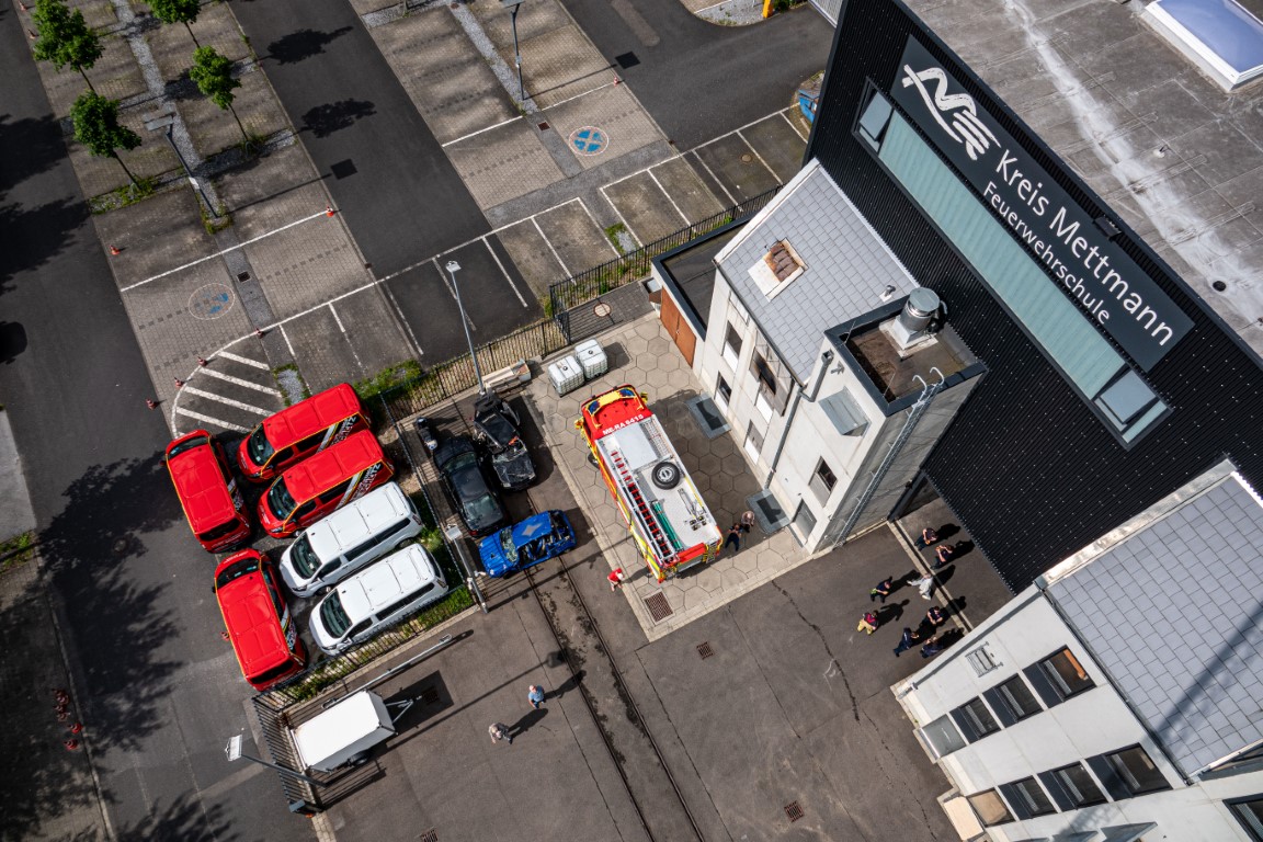 Rauch dringt aus dem Gebäude, ein Mann ruft im oberen Stockwerk um Hilfe, Sirenengeheul, die Freiwillige Feuerwehr rückt an. Heute ist es nur eine Übung, die die Ratinger Jonges im Rahmen ihres Besuches des Gefahrenabwehrzentrums in Mettmann miterleben!