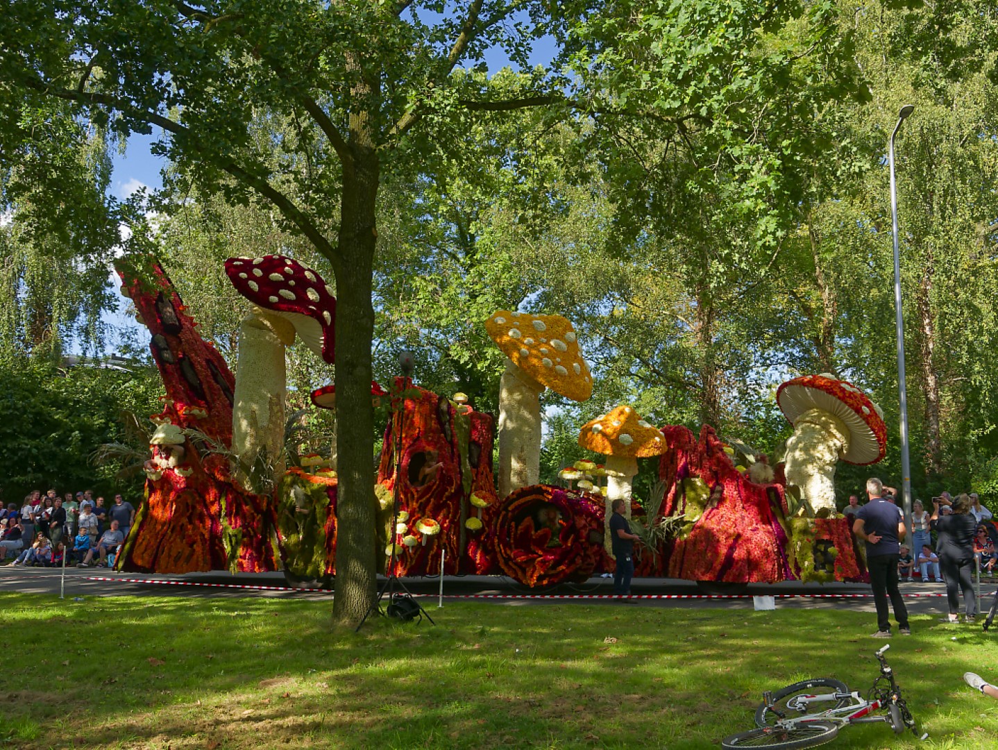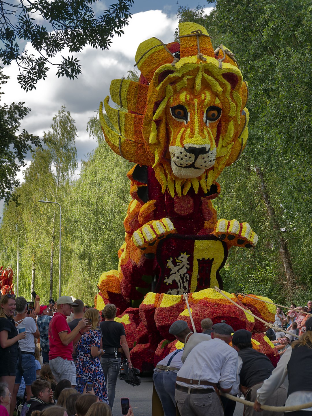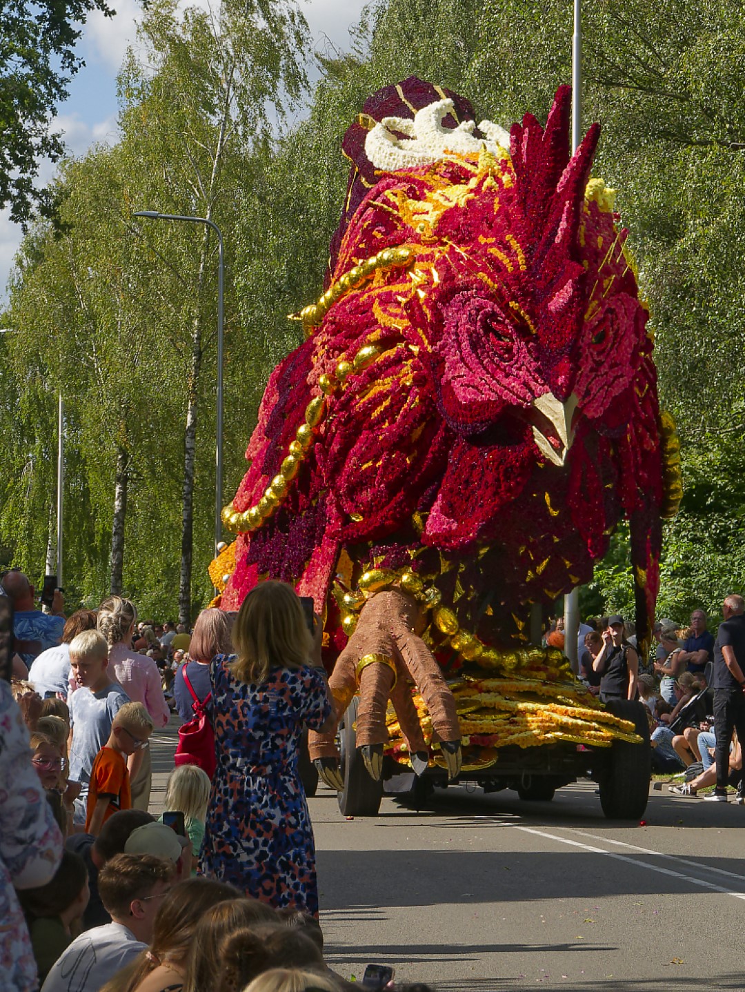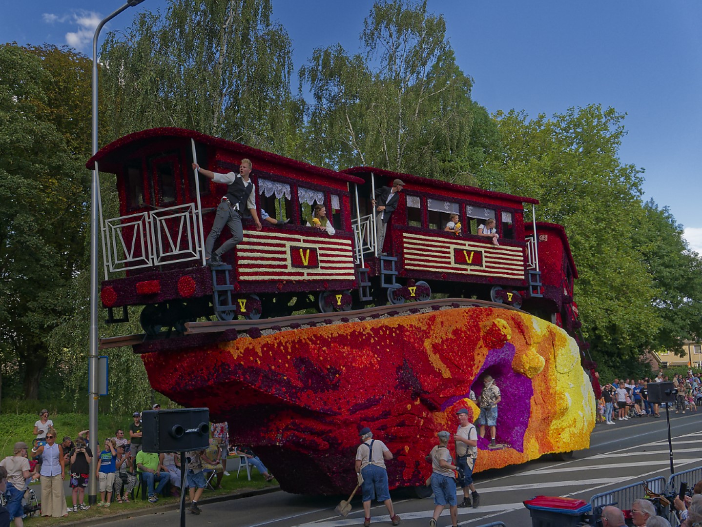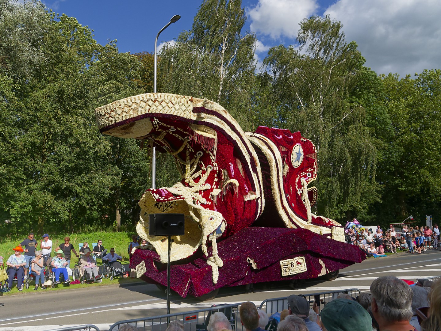 Wow! Damit hatte nun wirklich keiner der mitgefahrenen Jonges und Mädchers gerechnet – selbst die nicht, die sich vorher schon einige Bilder vom letztjährigen Blumencorso im Internet angeschaut hatten. Angefangen mit der Kindergruppe der Vereine, die auch schon mit kleinen blumengeschmückten Wägelchen an unseren Tribünenplätzen vorbeizogen, folgten dann 18 über und über mit Blumen oder auch mit Moos oder Gräsern phantastisch geschmückte Blumenwagen, zwischen denen mehrere Musikgruppen auch für nette Unterhaltung sorgten. Immer wieder hörte man die Worte „Wahnsinn“ oder sah das Staunen in den Gesichtern aller auf der Tribüne sitzenden Zuschauer, wenn einer der riesigen, mit bis zu 300.000 (teilweise auch gefärbten) Dahlien und bis zu 21 Meter langen und/oder auch bis zu acht Meter hohen Figurenwagen an uns vorbeizogen, bei denen sich auch noch zusätzlich bei den Figuren vieles bewegte. Toll, wenn man auch bedenkt, dass – bis bei der größten Figur – alle anderen Wagen nur mit Muskelkraft vorwärts bewegt wurden.