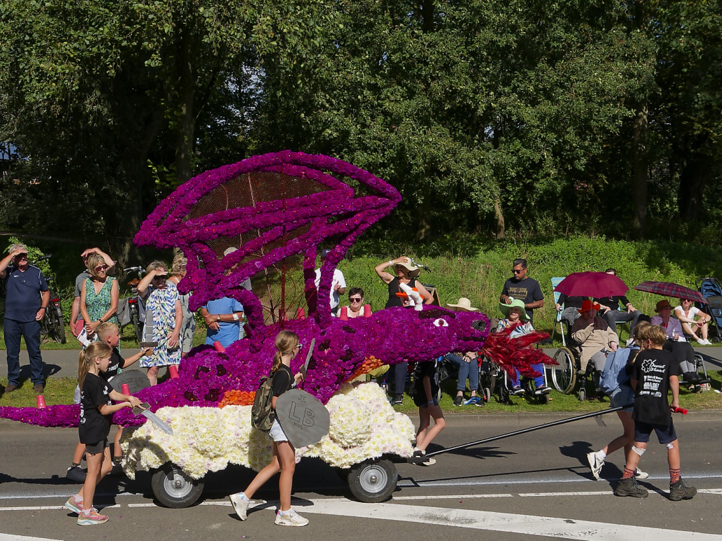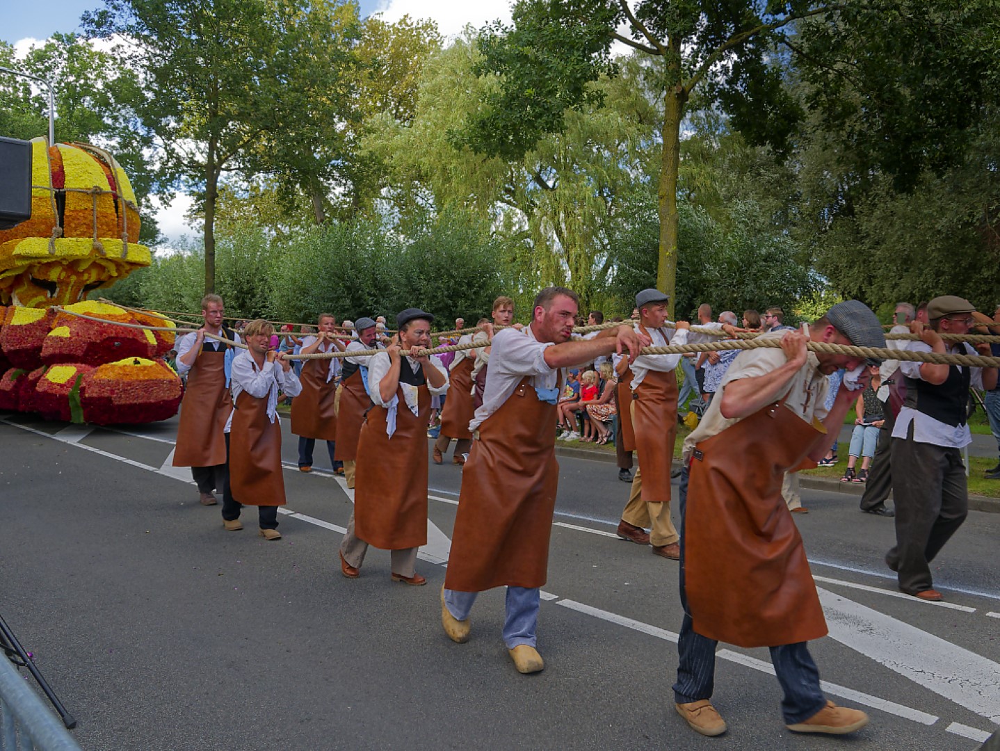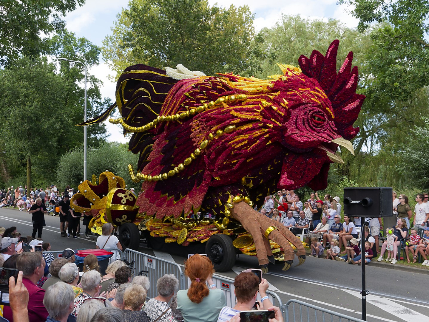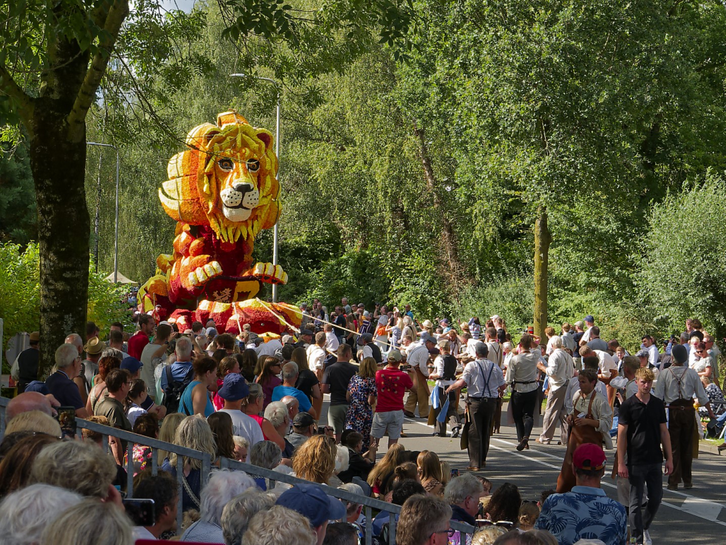 Wow! Damit hatte nun wirklich keiner der mitgefahrenen Jonges und Mädchers gerechnet – selbst die nicht, die sich vorher schon einige Bilder vom letztjährigen Blumencorso im Internet angeschaut hatten. Angefangen mit der Kindergruppe der Vereine, die auch schon mit kleinen blumengeschmückten Wägelchen an unseren Tribünenplätzen vorbeizogen, folgten dann 18 über und über mit Blumen oder auch mit Moos oder Gräsern phantastisch geschmückte Blumenwagen, zwischen denen mehrere Musikgruppen auch für nette Unterhaltung sorgten. Immer wieder hörte man die Worte „Wahnsinn“ oder sah das Staunen in den Gesichtern aller auf der Tribüne sitzenden Zuschauer, wenn einer der riesigen, mit bis zu 300.000 (teilweise auch gefärbten) Dahlien und bis zu 21 Meter langen und/oder auch bis zu acht Meter hohen Figurenwagen an uns vorbeizogen, bei denen sich auch noch zusätzlich bei den Figuren vieles bewegte. Toll, wenn man auch bedenkt, dass – bis bei der größten Figur – alle anderen Wagen nur mit Muskelkraft vorwärts bewegt wurden.