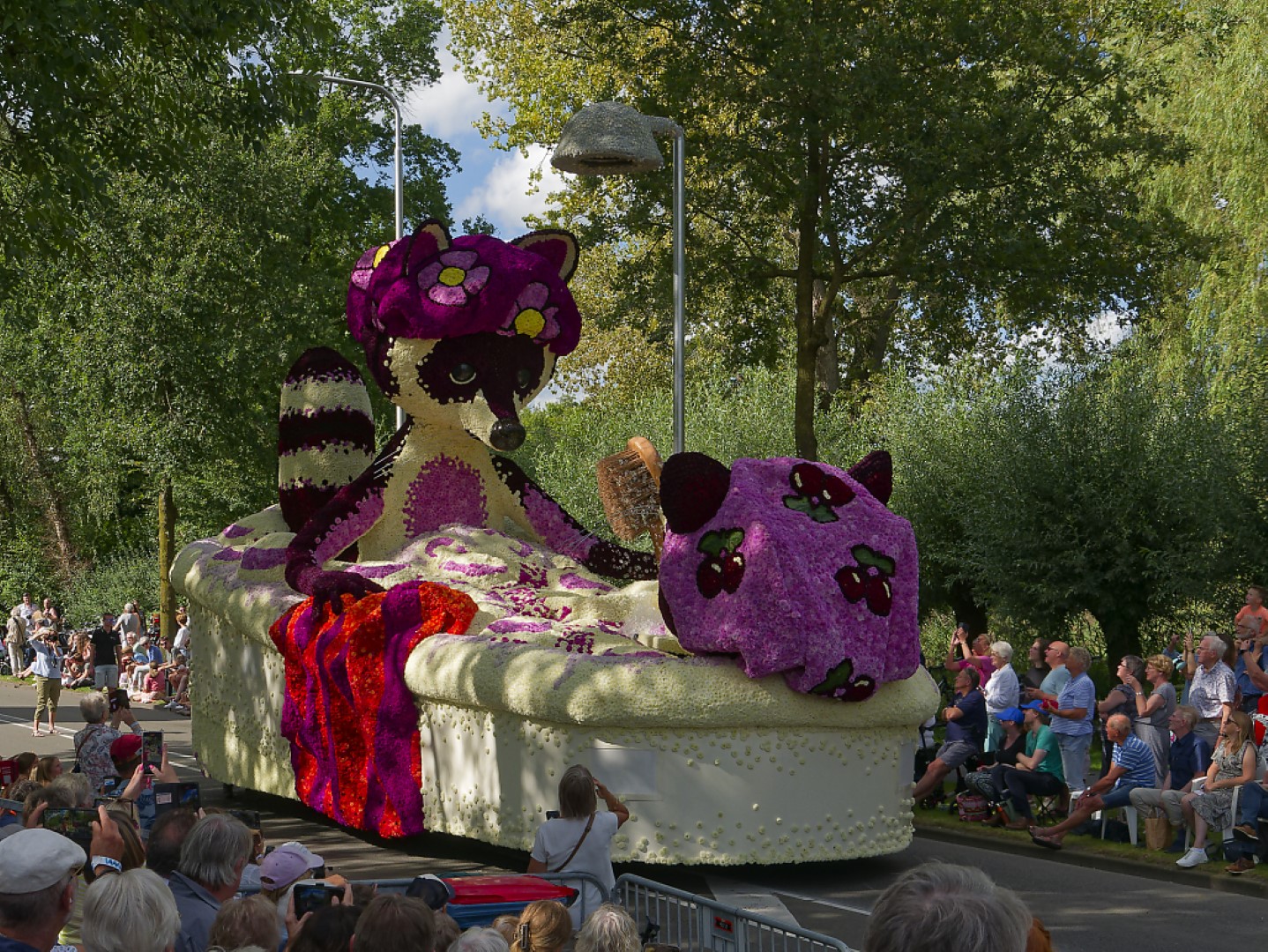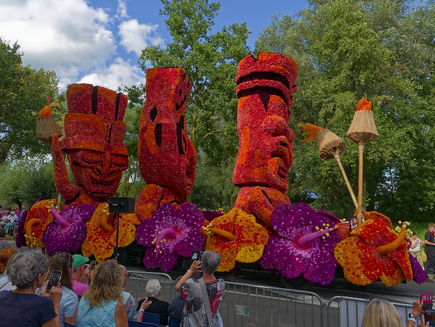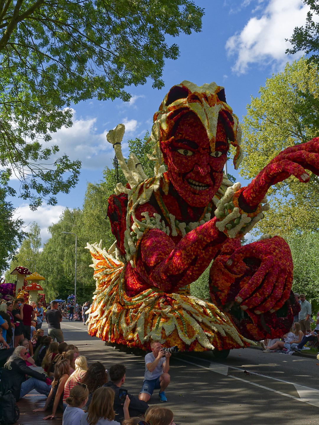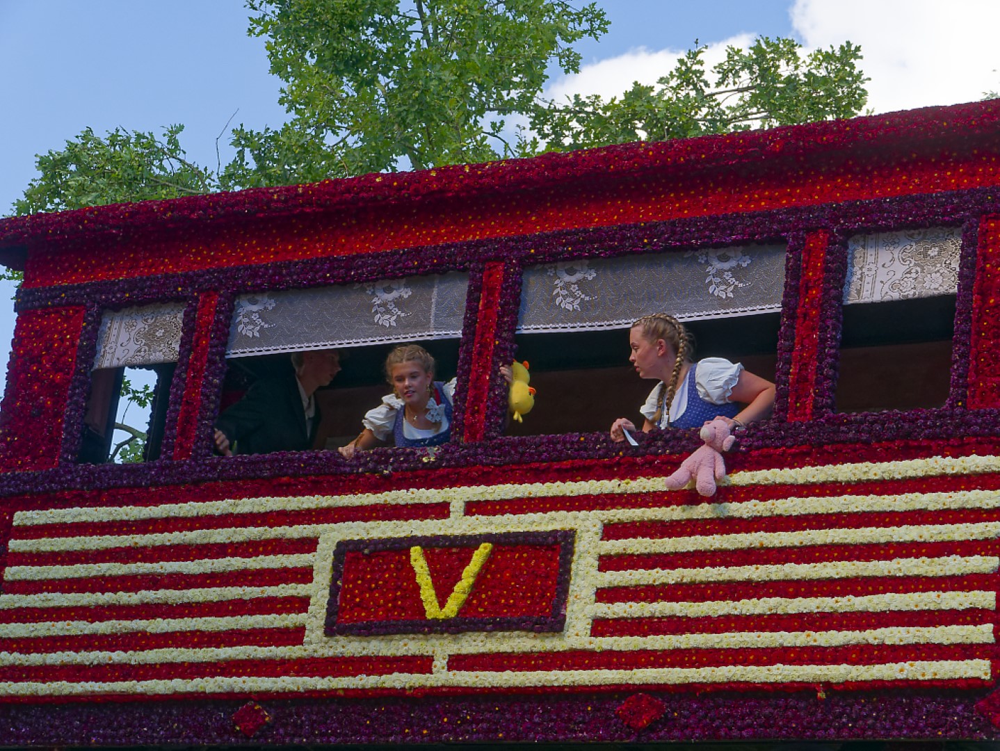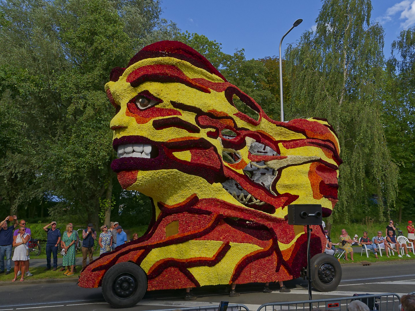 Wow! Damit hatte nun wirklich keiner der mitgefahrenen Jonges und Mädchers gerechnet – selbst die nicht, die sich vorher schon einige Bilder vom letztjährigen Blumencorso im Internet angeschaut hatten. Angefangen mit der Kindergruppe der Vereine, die auch schon mit kleinen blumengeschmückten Wägelchen an unseren Tribünenplätzen vorbeizogen, folgten dann 18 über und über mit Blumen oder auch mit Moos oder Gräsern phantastisch geschmückte Blumenwagen, zwischen denen mehrere Musikgruppen auch für nette Unterhaltung sorgten. Immer wieder hörte man die Worte „Wahnsinn“ oder sah das Staunen in den Gesichtern aller auf der Tribüne sitzenden Zuschauer, wenn einer der riesigen, mit bis zu 300.000 (teilweise auch gefärbten) Dahlien und bis zu 21 Meter langen und/oder auch bis zu acht Meter hohen Figurenwagen an uns vorbeizogen, bei denen sich auch noch zusätzlich bei den Figuren vieles bewegte. Toll, wenn man auch bedenkt, dass – bis bei der größten Figur – alle anderen Wagen nur mit Muskelkraft vorwärts bewegt wurden.