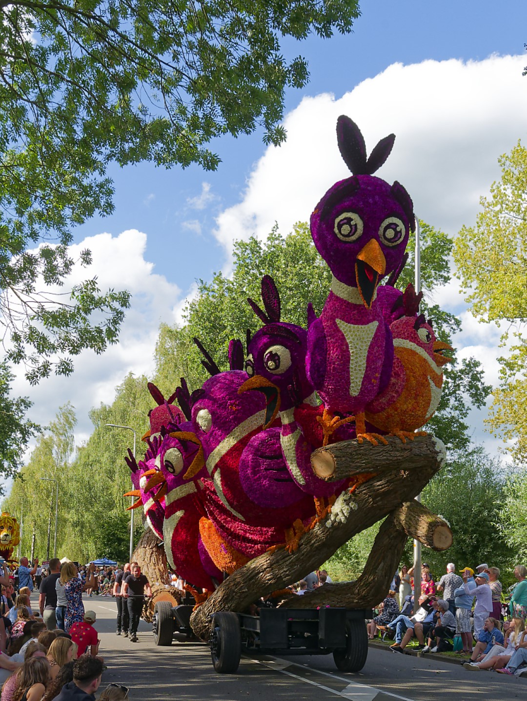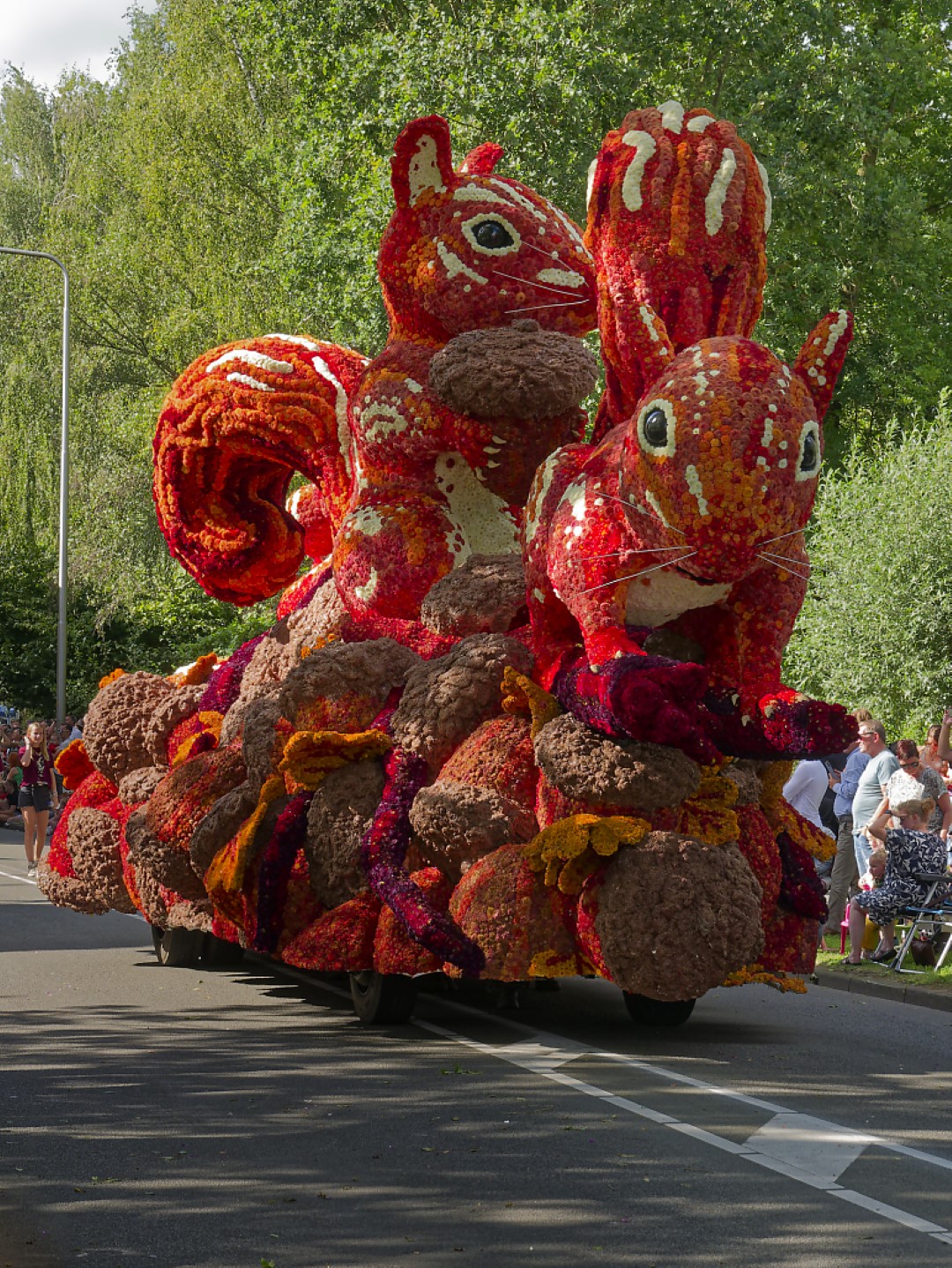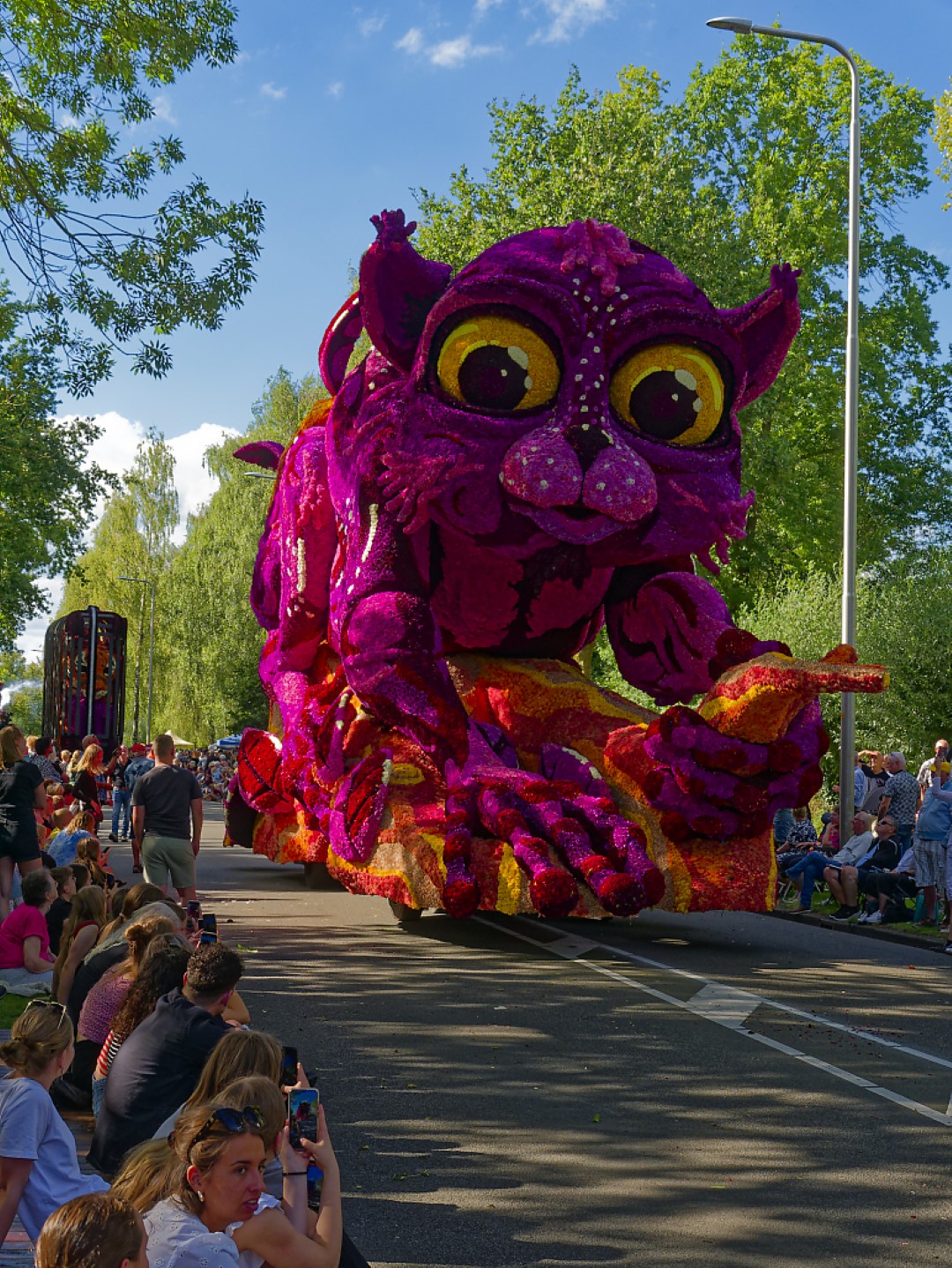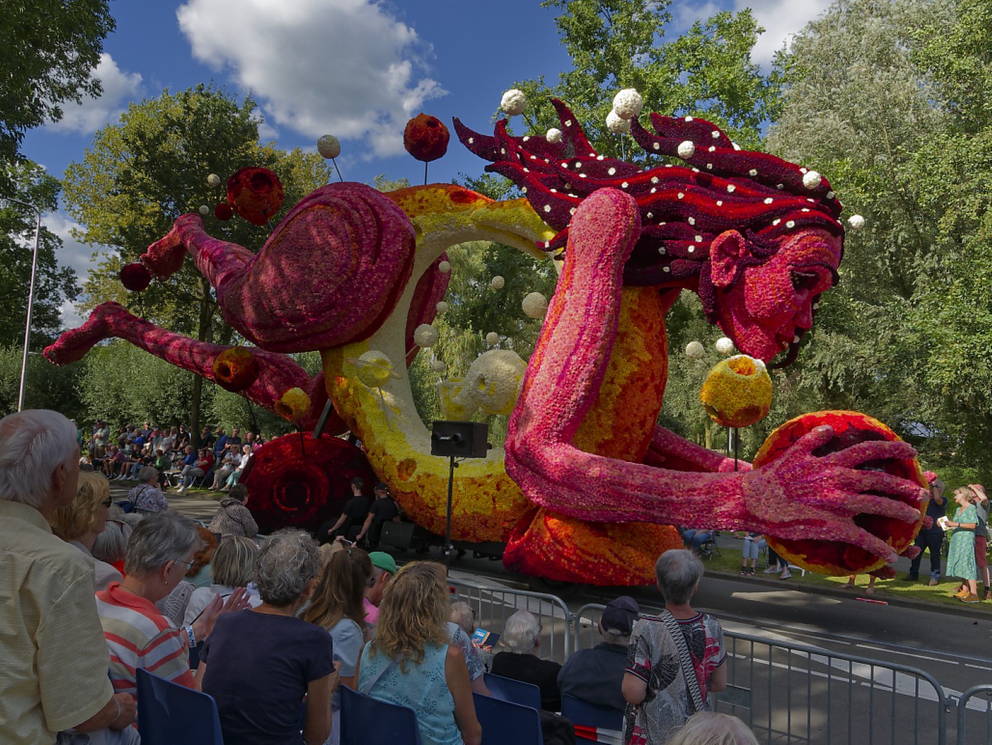Wow! Damit hatte nun wirklich keiner der mitgefahrenen Jonges und Mädchers gerechnet – selbst die nicht, die sich vorher schon einige Bilder vom letztjährigen Blumencorso im Internet angeschaut hatten. Angefangen mit der Kindergruppe der Vereine, die auch schon mit kleinen blumengeschmückten Wägelchen an unseren Tribünenplätzen vorbeizogen, folgten dann 18 über und über mit Blumen oder auch mit Moos oder Gräsern phantastisch geschmückte Blumenwagen, zwischen denen mehrere Musikgruppen auch für nette Unterhaltung sorgten. Immer wieder hörte man die Worte „Wahnsinn“ oder sah das Staunen in den Gesichtern aller auf der Tribüne sitzenden Zuschauer, wenn einer der riesigen, mit bis zu 300.000 (teilweise auch gefärbten) Dahlien und bis zu 21 Meter langen und/oder auch bis zu acht Meter hohen Figurenwagen an uns vorbeizogen, bei denen sich auch noch zusätzlich bei den Figuren vieles bewegte. Toll, wenn man auch bedenkt, dass – bis bei der größten Figur – alle anderen Wagen nur mit Muskelkraft vorwärts bewegt wurden.