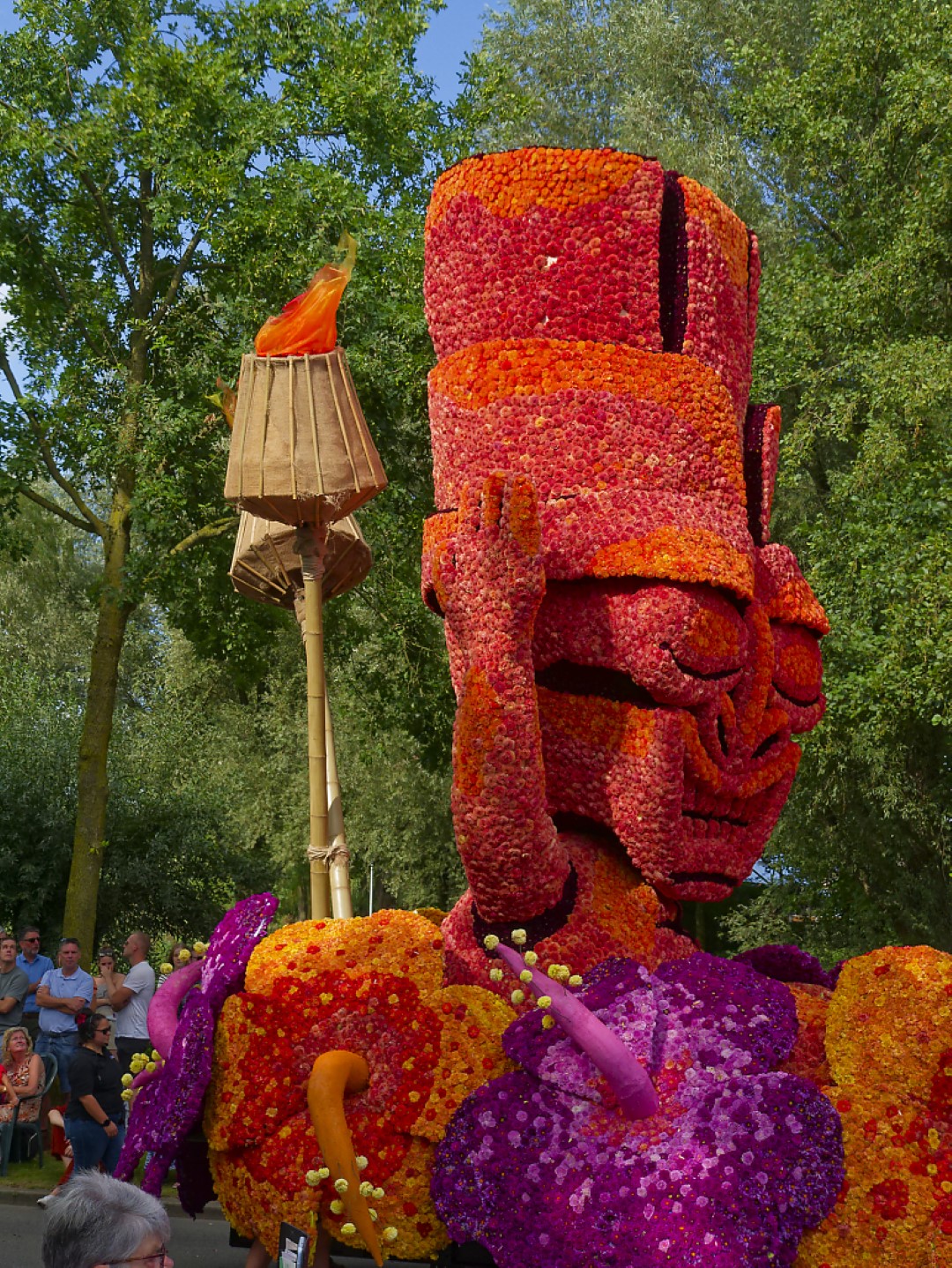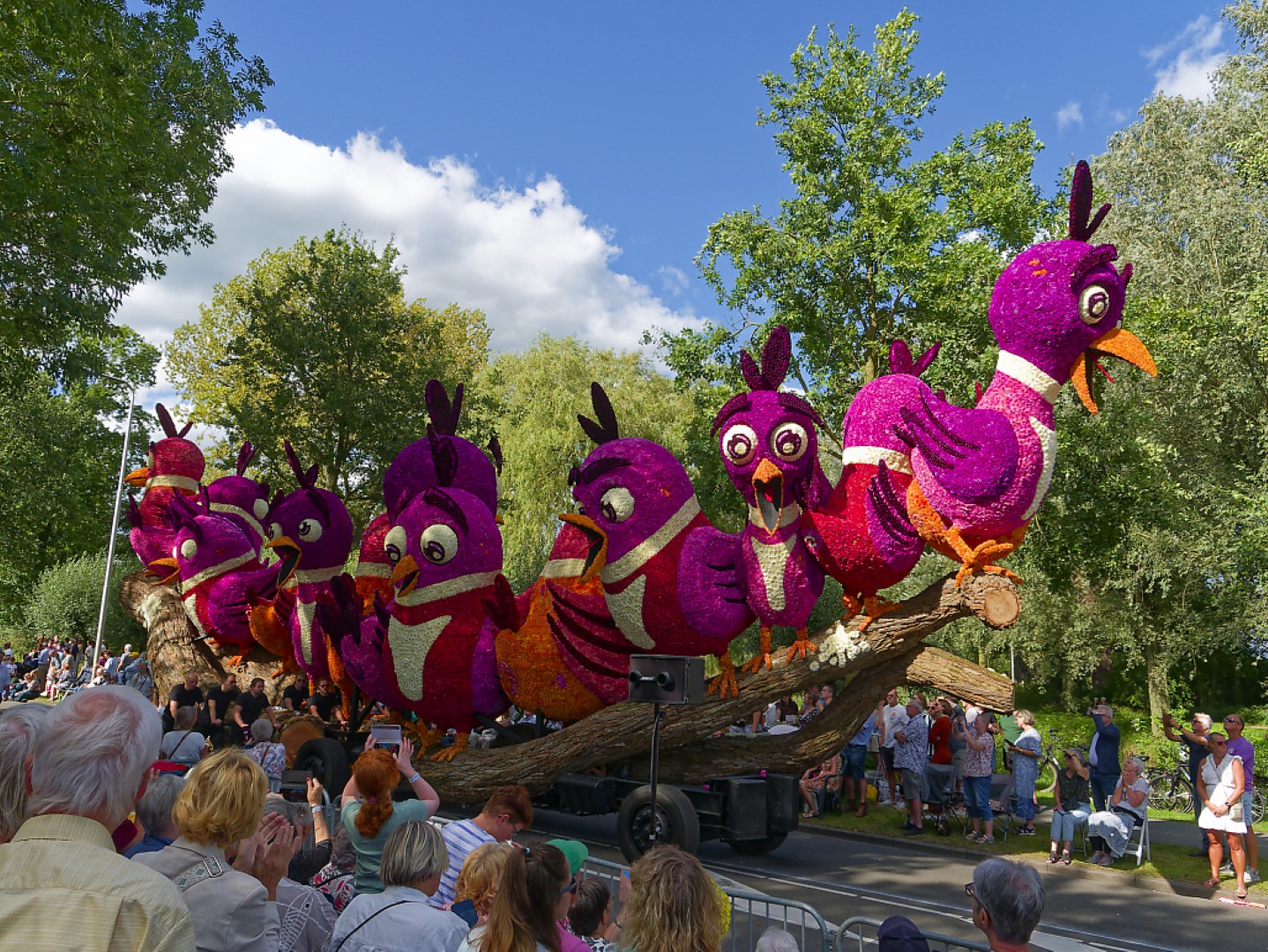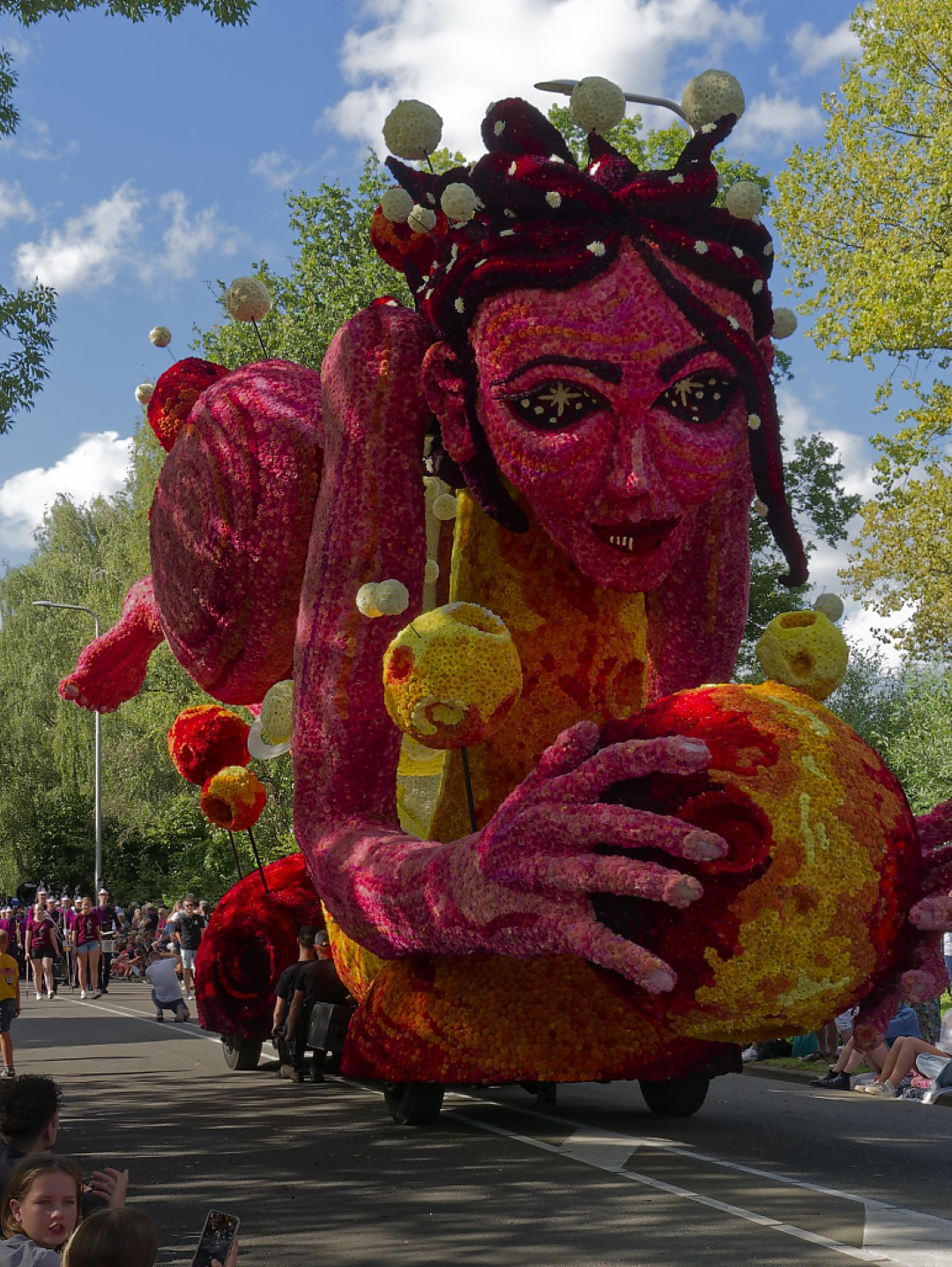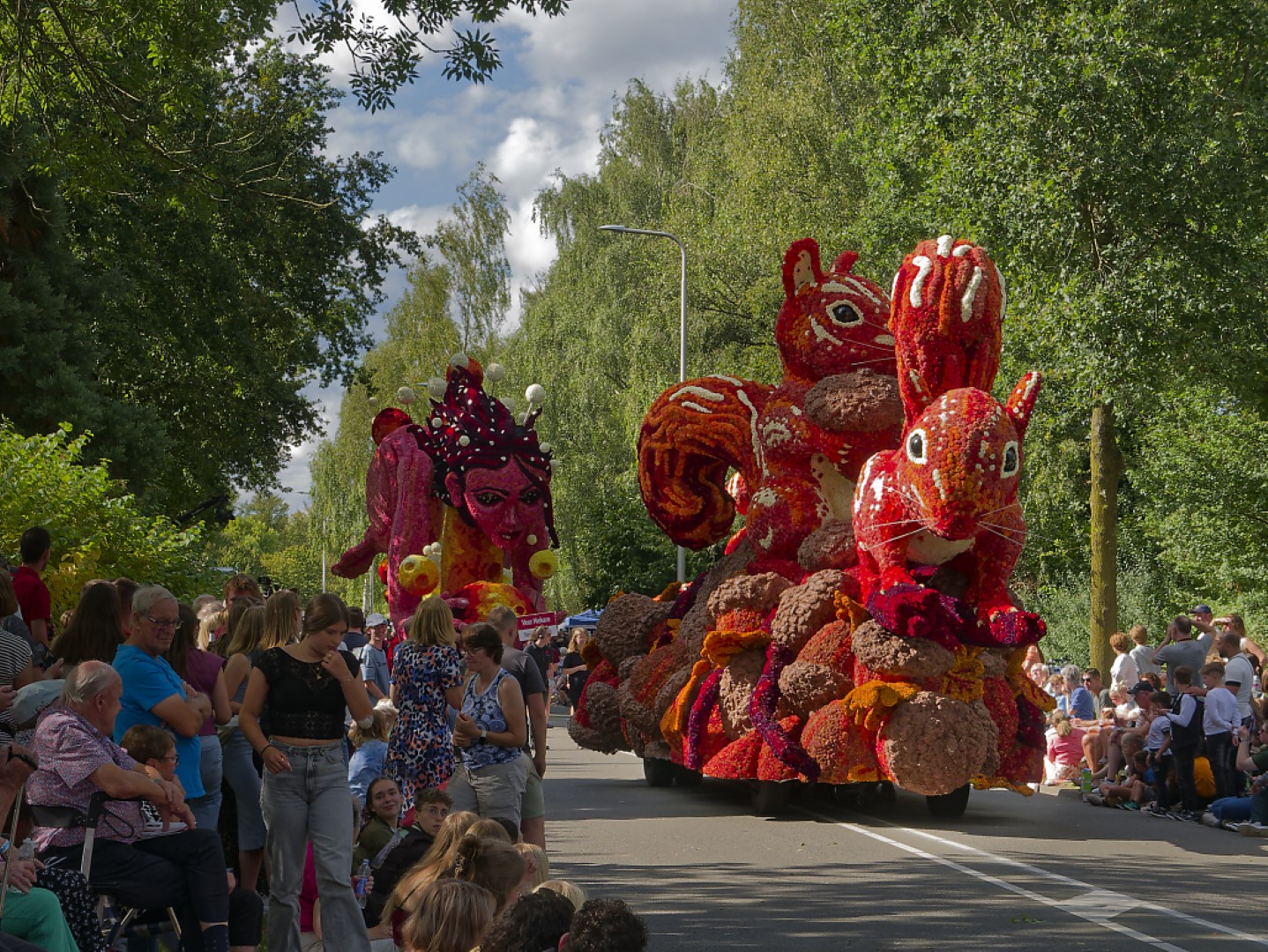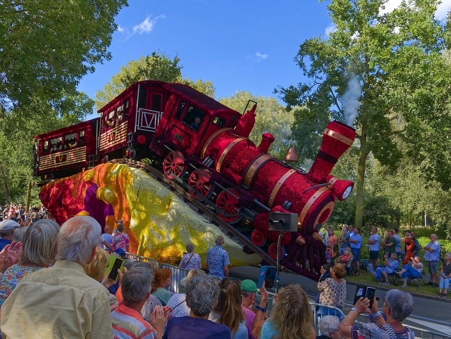 Wow! Damit hatte nun wirklich keiner der mitgefahrenen Jonges und Mädchers gerechnet – selbst die nicht, die sich vorher schon einige Bilder vom letztjährigen Blumencorso im Internet angeschaut hatten. Angefangen mit der Kindergruppe der Vereine, die auch schon mit kleinen blumengeschmückten Wägelchen an unseren Tribünenplätzen vorbeizogen, folgten dann 18 über und über mit Blumen oder auch mit Moos oder Gräsern phantastisch geschmückte Blumenwagen, zwischen denen mehrere Musikgruppen auch für nette Unterhaltung sorgten. Immer wieder hörte man die Worte „Wahnsinn“ oder sah das Staunen in den Gesichtern aller auf der Tribüne sitzenden Zuschauer, wenn einer der riesigen, mit bis zu 300.000 (teilweise auch gefärbten) Dahlien und bis zu 21 Meter langen und/oder auch bis zu acht Meter hohen Figurenwagen an uns vorbeizogen, bei denen sich auch noch zusätzlich bei den Figuren vieles bewegte. Toll, wenn man auch bedenkt, dass – bis bei der größten Figur – alle anderen Wagen nur mit Muskelkraft vorwärts bewegt wurden.