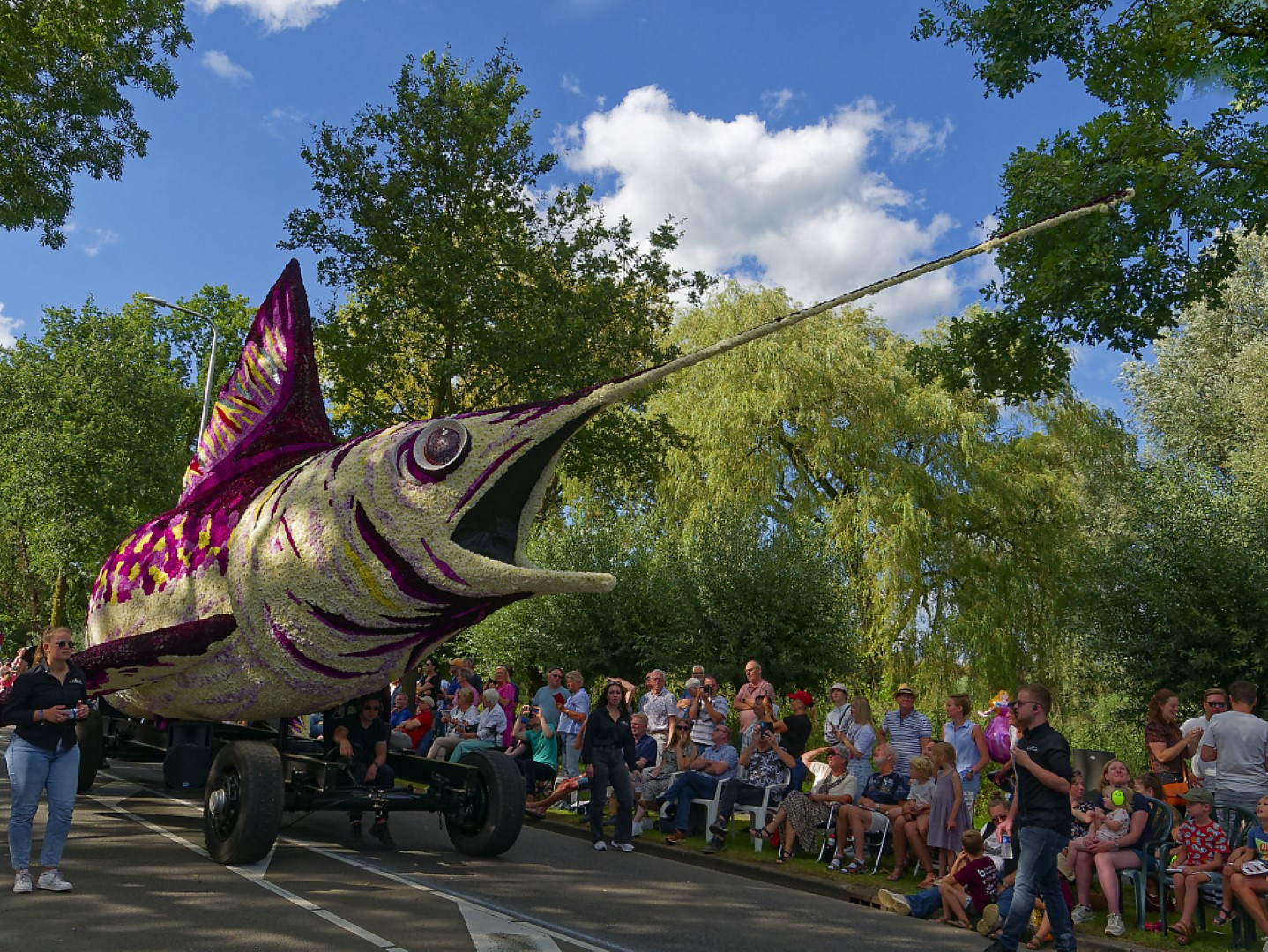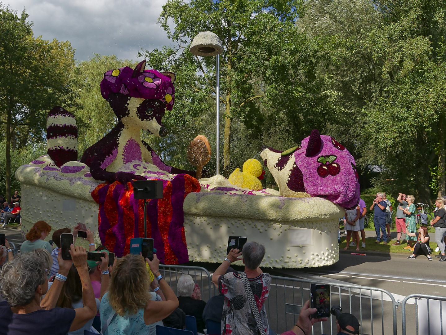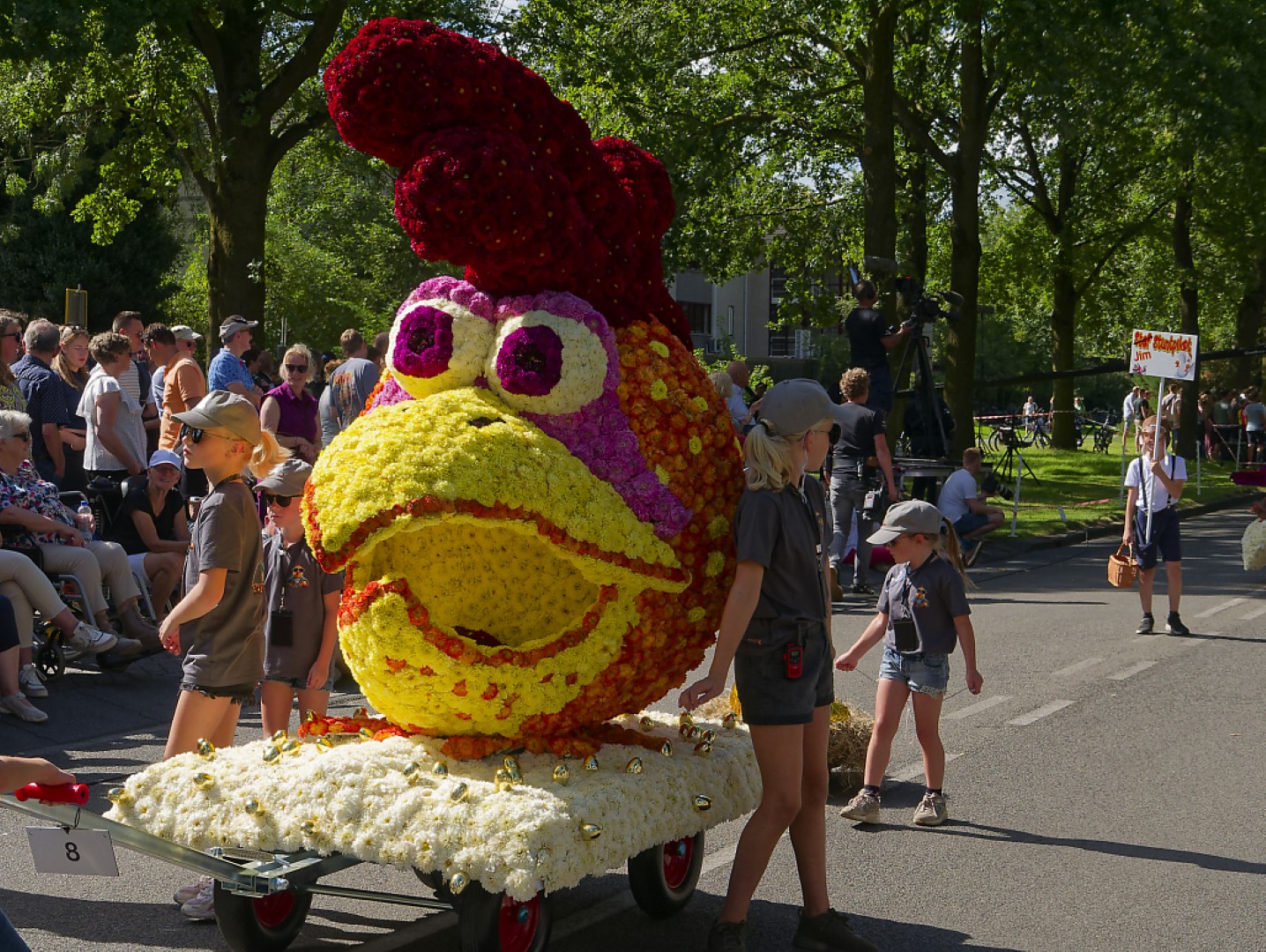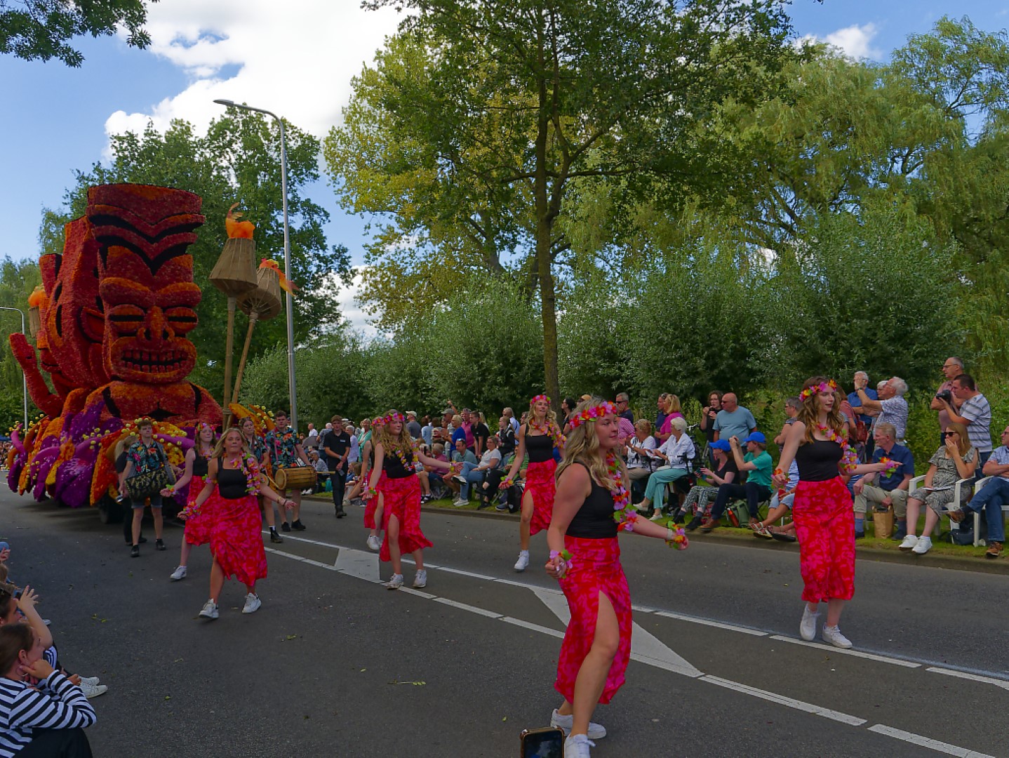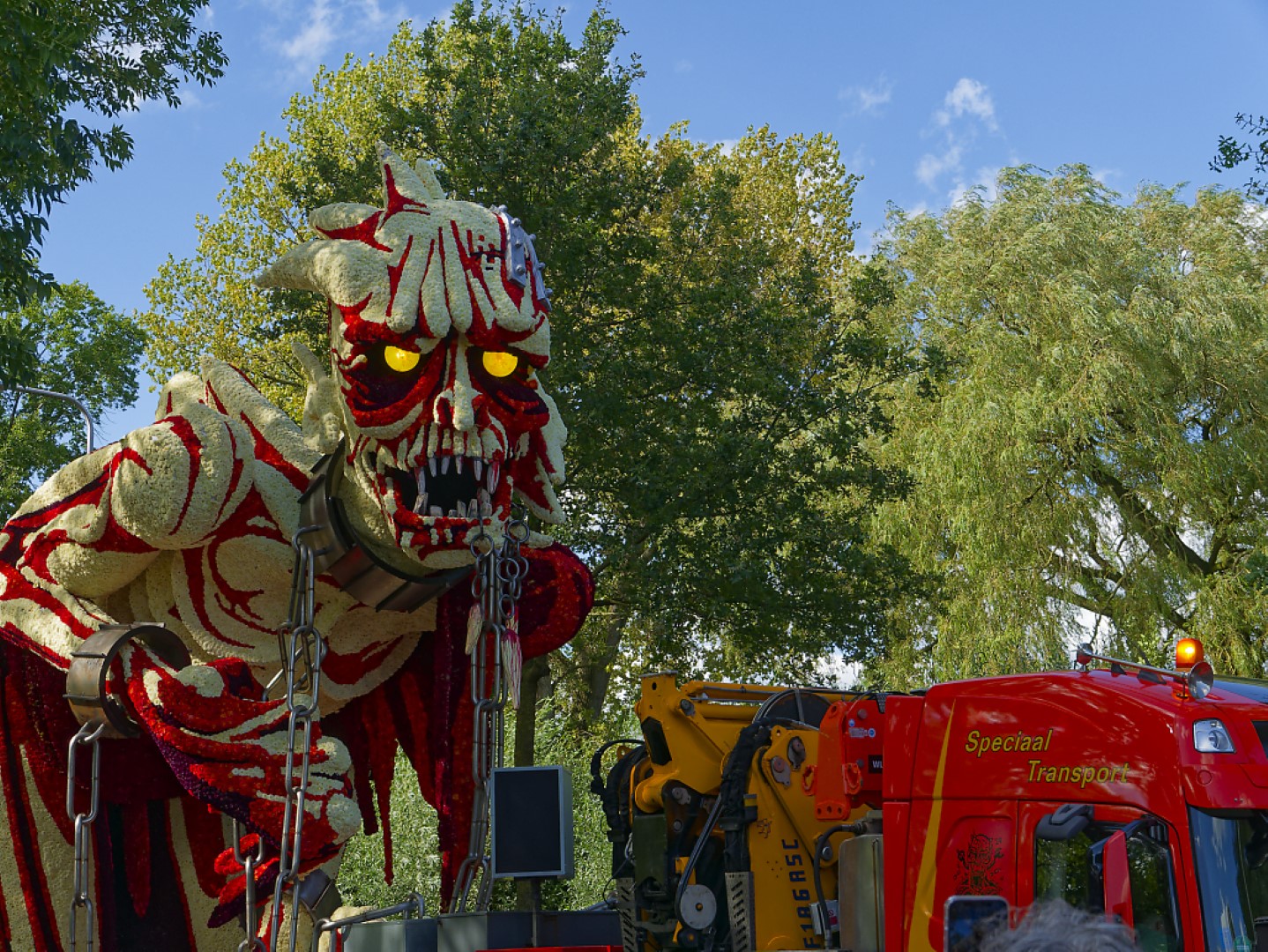 Wow! Damit hatte nun wirklich keiner der mitgefahrenen Jonges und Mädchers gerechnet – selbst die nicht, die sich vorher schon einige Bilder vom letztjährigen Blumencorso im Internet angeschaut hatten. Angefangen mit der Kindergruppe der Vereine, die auch schon mit kleinen blumengeschmückten Wägelchen an unseren Tribünenplätzen vorbeizogen, folgten dann 18 über und über mit Blumen oder auch mit Moos oder Gräsern phantastisch geschmückte Blumenwagen, zwischen denen mehrere Musikgruppen auch für nette Unterhaltung sorgten. Immer wieder hörte man die Worte „Wahnsinn“ oder sah das Staunen in den Gesichtern aller auf der Tribüne sitzenden Zuschauer, wenn einer der riesigen, mit bis zu 300.000 (teilweise auch gefärbten) Dahlien und bis zu 21 Meter langen und/oder auch bis zu acht Meter hohen Figurenwagen an uns vorbeizogen, bei denen sich auch noch zusätzlich bei den Figuren vieles bewegte. Toll, wenn man auch bedenkt, dass – bis bei der größten Figur – alle anderen Wagen nur mit Muskelkraft vorwärts bewegt wurden.