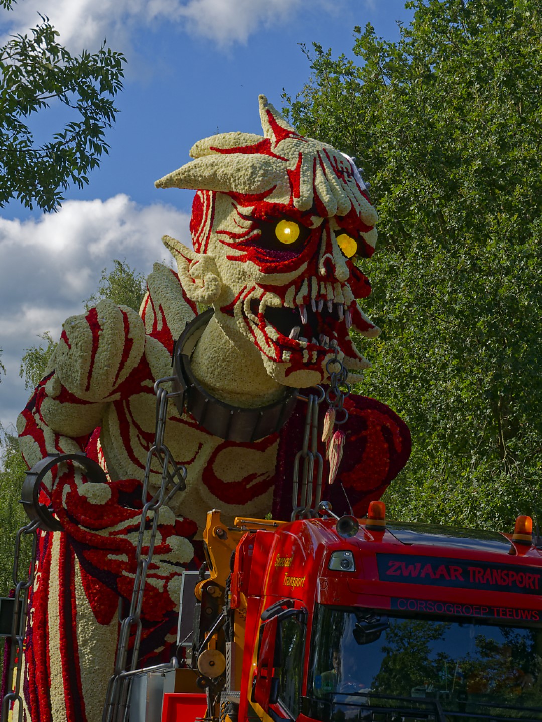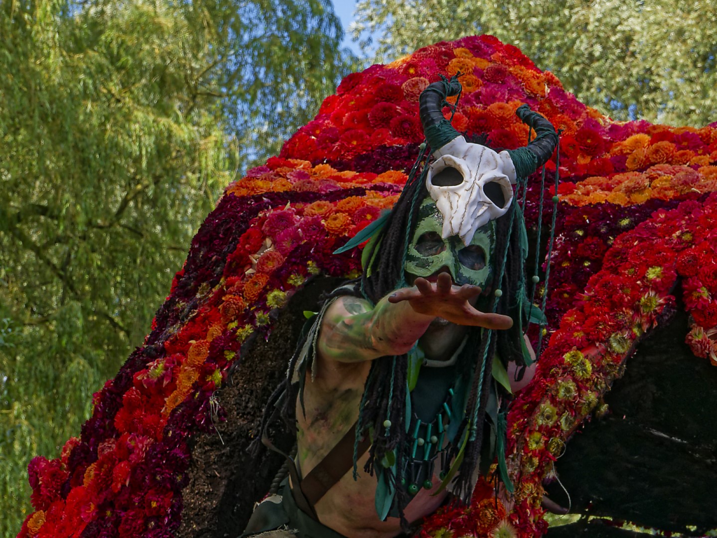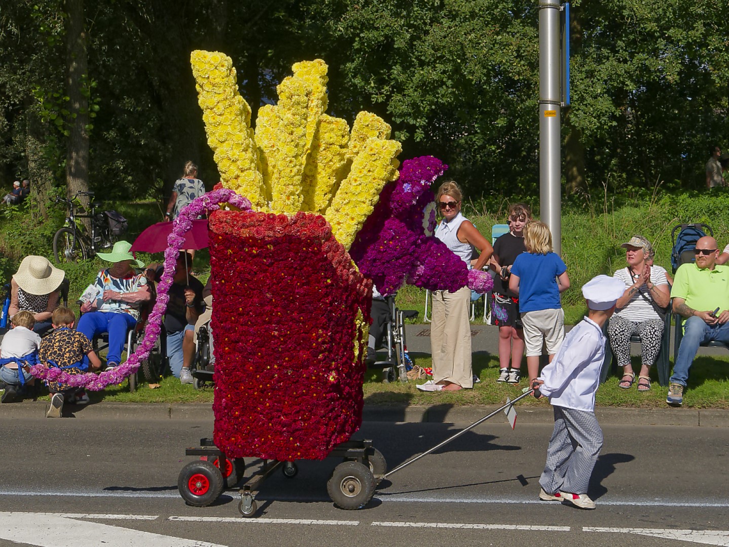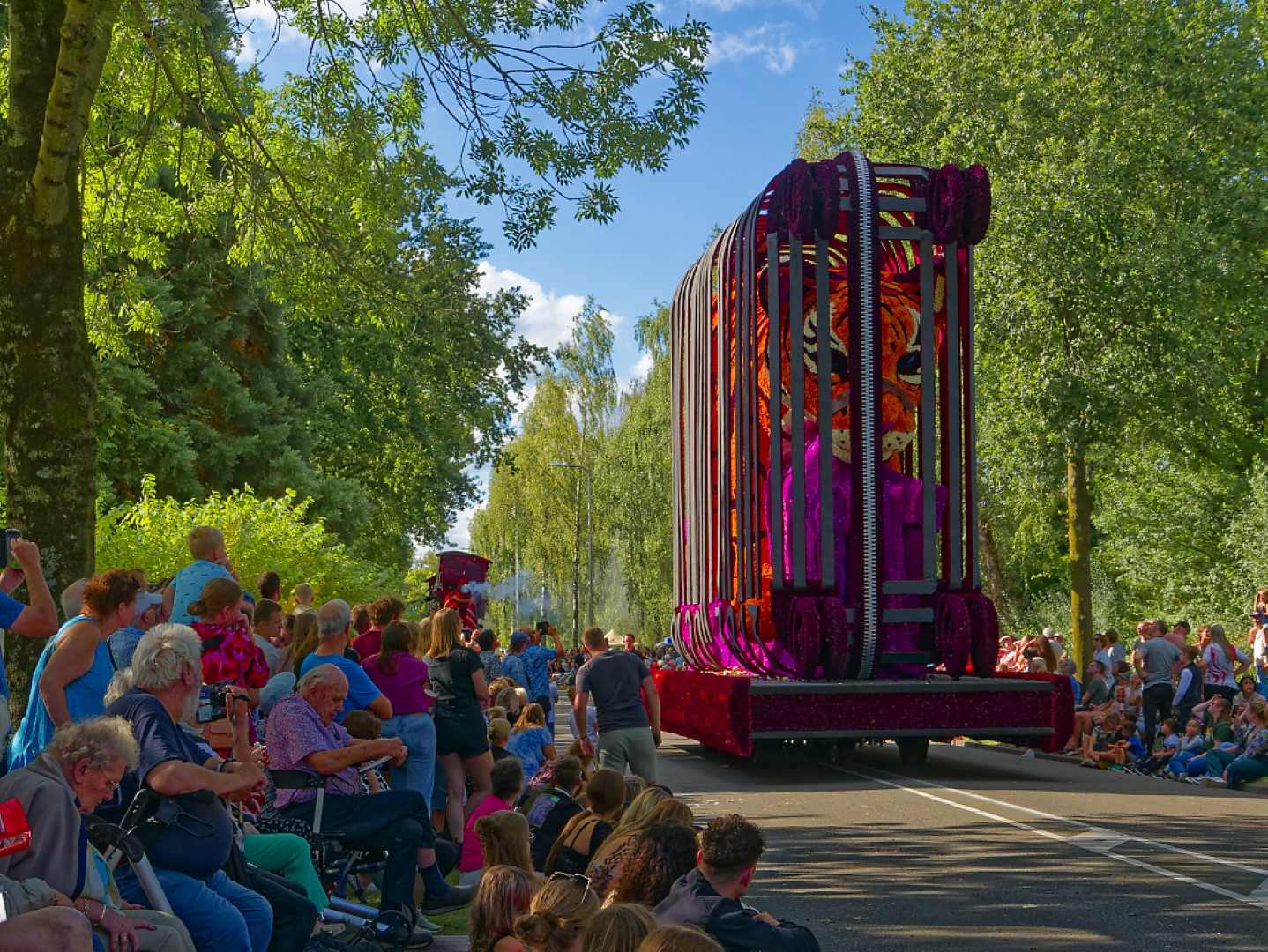 Wow! Damit hatte nun wirklich keiner der mitgefahrenen Jonges und Mädchers gerechnet – selbst die nicht, die sich vorher schon einige Bilder vom letztjährigen Blumencorso im Internet angeschaut hatten. Angefangen mit der Kindergruppe der Vereine, die auch schon mit kleinen blumengeschmückten Wägelchen an unseren Tribünenplätzen vorbeizogen, folgten dann 18 über und über mit Blumen oder auch mit Moos oder Gräsern phantastisch geschmückte Blumenwagen, zwischen denen mehrere Musikgruppen auch für nette Unterhaltung sorgten. Immer wieder hörte man die Worte „Wahnsinn“ oder sah das Staunen in den Gesichtern aller auf der Tribüne sitzenden Zuschauer, wenn einer der riesigen, mit bis zu 300.000 (teilweise auch gefärbten) Dahlien und bis zu 21 Meter langen und/oder auch bis zu acht Meter hohen Figurenwagen an uns vorbeizogen, bei denen sich auch noch zusätzlich bei den Figuren vieles bewegte. Toll, wenn man auch bedenkt, dass – bis bei der größten Figur – alle anderen Wagen nur mit Muskelkraft vorwärts bewegt wurden.