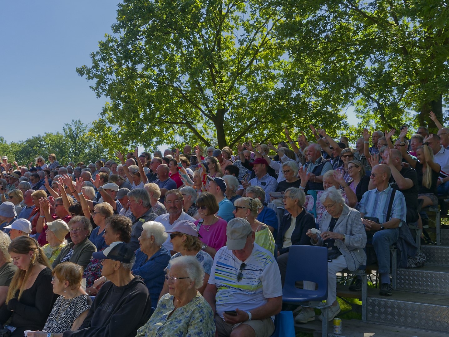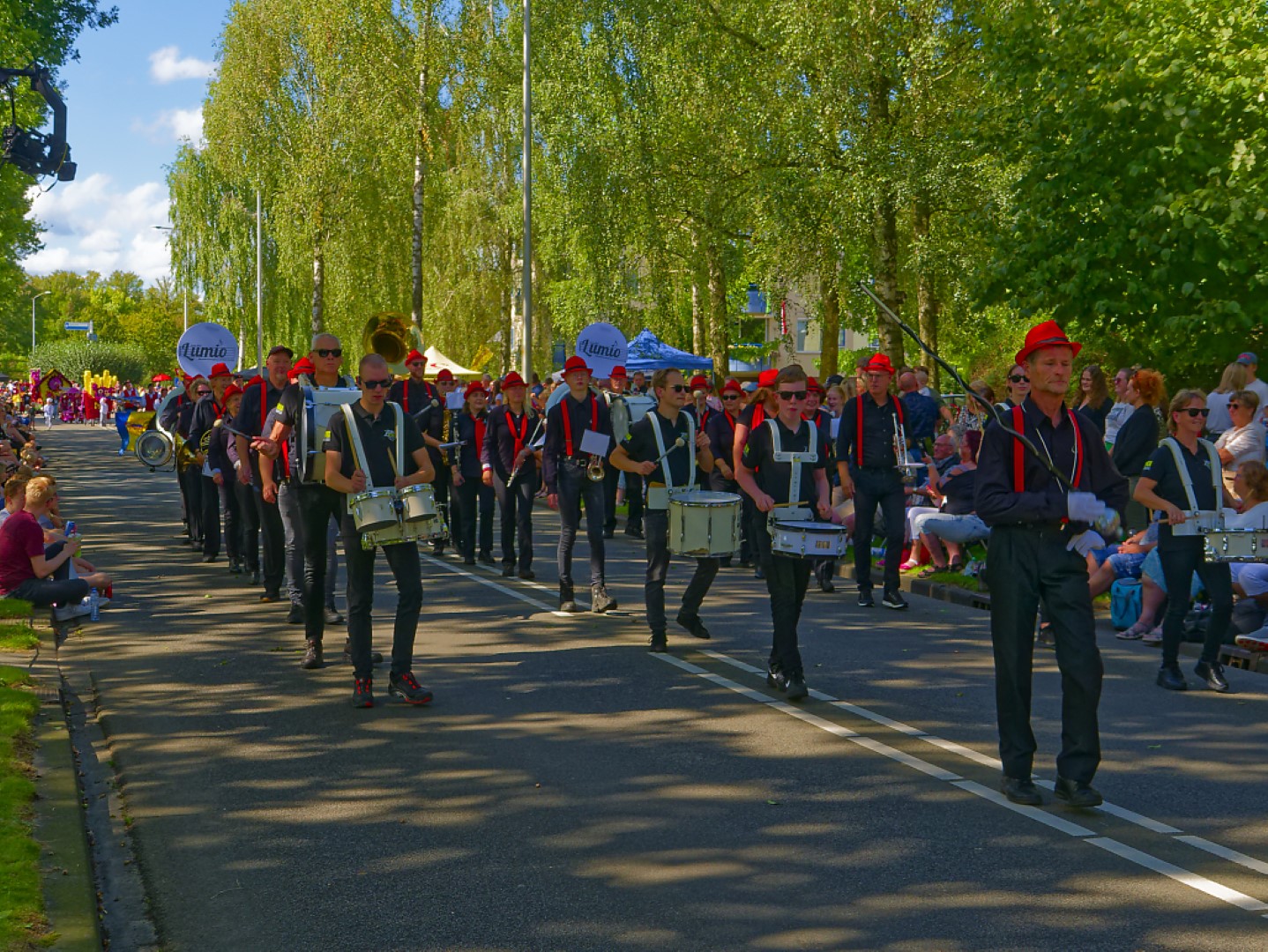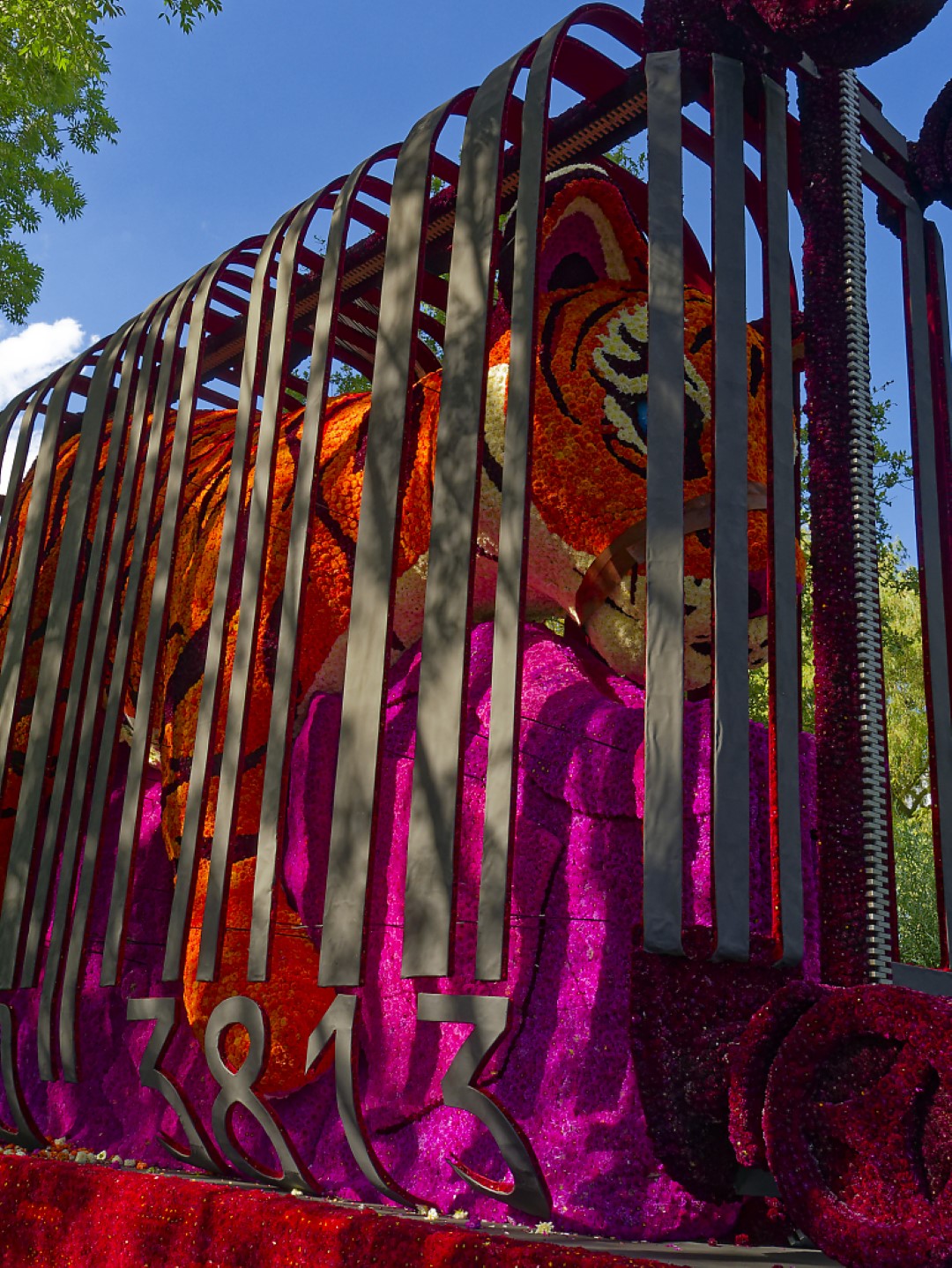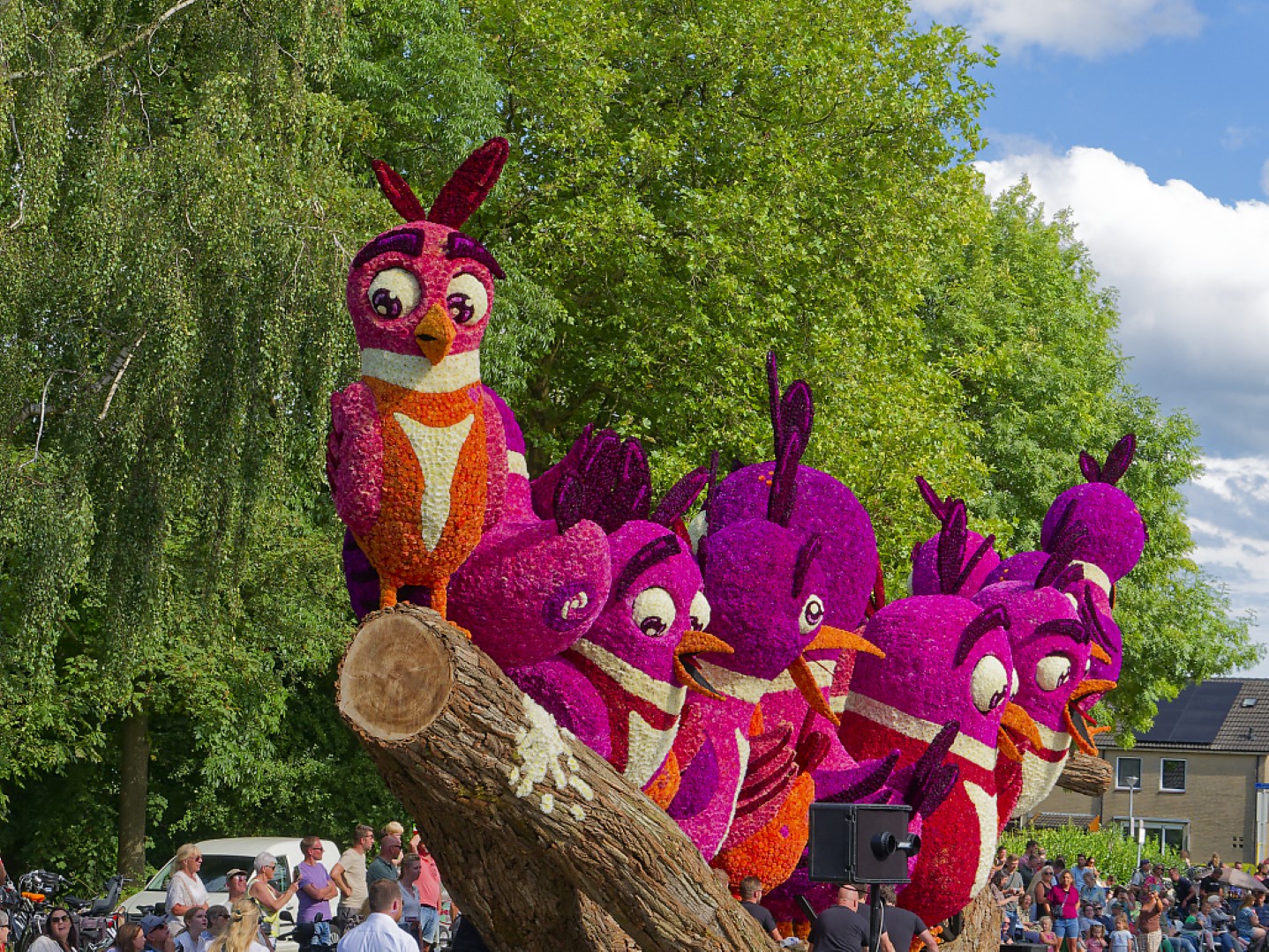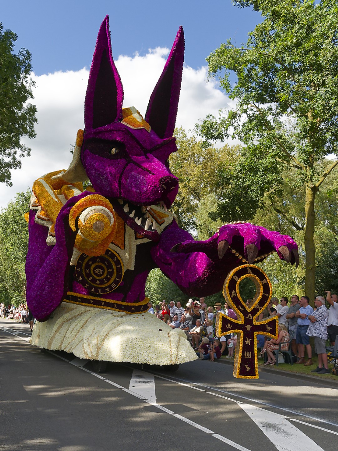 Wow! Damit hatte nun wirklich keiner der mitgefahrenen Jonges und Mädchers gerechnet – selbst die nicht, die sich vorher schon einige Bilder vom letztjährigen Blumencorso im Internet angeschaut hatten. Angefangen mit der Kindergruppe der Vereine, die auch schon mit kleinen blumengeschmückten Wägelchen an unseren Tribünenplätzen vorbeizogen, folgten dann 18 über und über mit Blumen oder auch mit Moos oder Gräsern phantastisch geschmückte Blumenwagen, zwischen denen mehrere Musikgruppen auch für nette Unterhaltung sorgten. Immer wieder hörte man die Worte „Wahnsinn“ oder sah das Staunen in den Gesichtern aller auf der Tribüne sitzenden Zuschauer, wenn einer der riesigen, mit bis zu 300.000 (teilweise auch gefärbten) Dahlien und bis zu 21 Meter langen und/oder auch bis zu acht Meter hohen Figurenwagen an uns vorbeizogen, bei denen sich auch noch zusätzlich bei den Figuren vieles bewegte. Toll, wenn man auch bedenkt, dass – bis bei der größten Figur – alle anderen Wagen nur mit Muskelkraft vorwärts bewegt wurden.