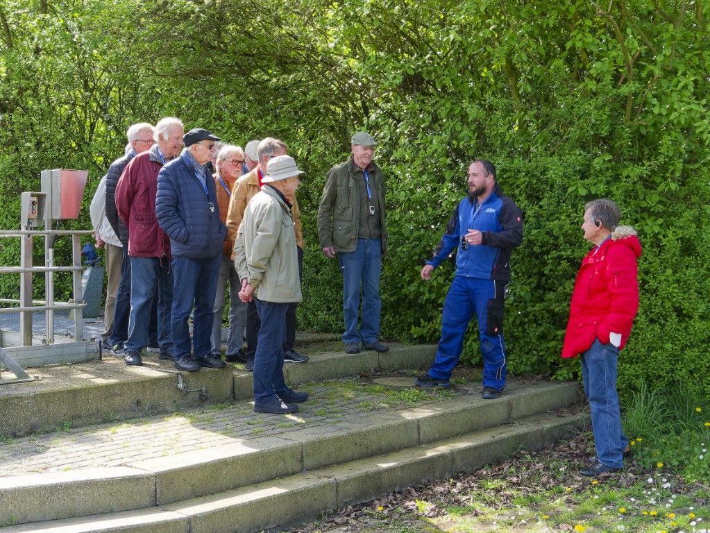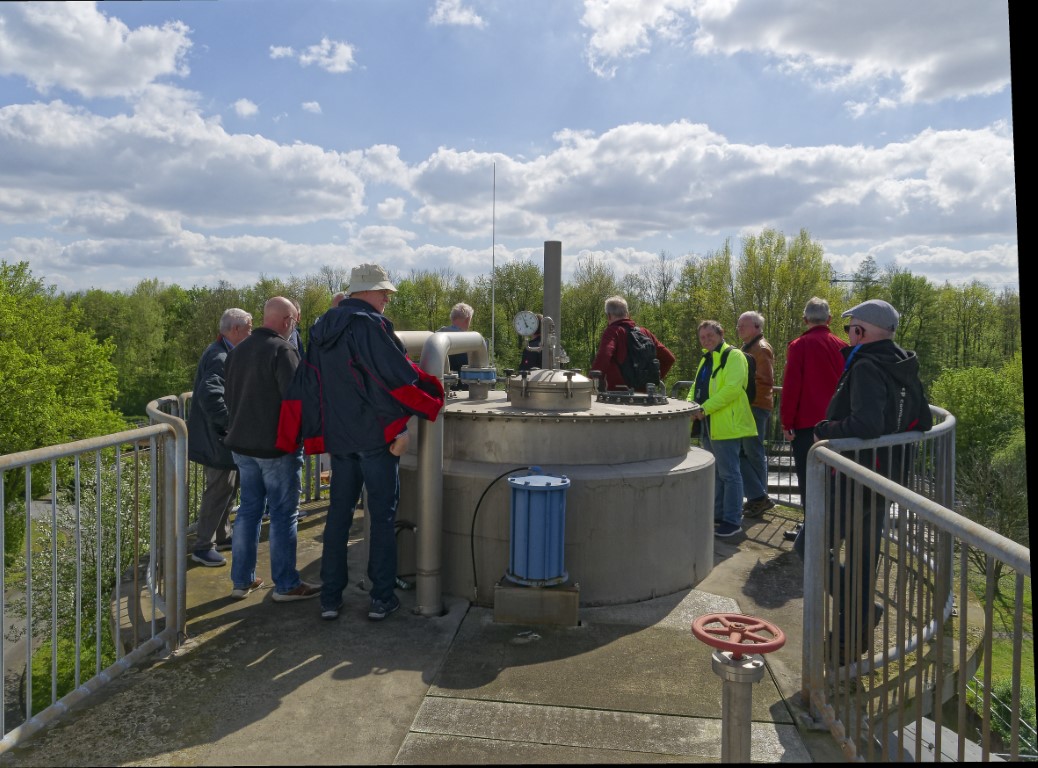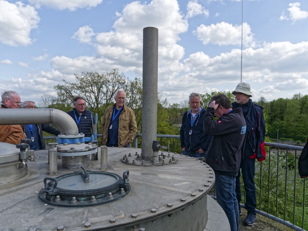 So ging es denn vom Zulauf der gesamten Ratinger Abwässer zuerst zur Rechenanlage. Dort wird nicht gerechnet, sondern mit Rechen die erste grobe Reinigung stattfindet. Danach ging es weiter zum Sandfang, in dem Sand und Fett entfernt werden, gefolgt von der Vorklärung (hier ist die mechanische Reinigung abgeschlossen und die biologische Reinigung beginnt) übers Belebungsbecken bis zur Nachklärung, wobei das jetzt nur ein kurzer Anriss des gesamten Reinigungsprozesses darstellt. Interessant war auch zu erfahren, dass das im Faulbehälter entstehende Klärgas hauptsächlich aus Methan besteht und als Brennstoff im Klärwerk zur Strom- und Wärmeerzeugung genutzt wird. Dadurch wird ein Großteil des im Klärwerk verbrauchten Stroms selbst erzeugt. Die Abwärme der Motoren wiederum wird für die Beheizung der Faulbehälter und der Betriebsgebäude genutzt. Interessant war dann noch der Besuch auf dem Faulturm, um von dort aus einen guten Blick über die gesamte Anlage zu haben.