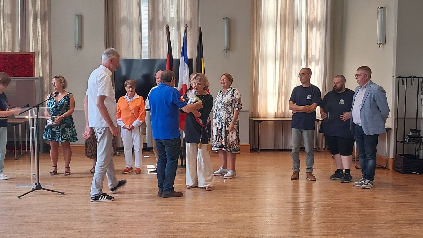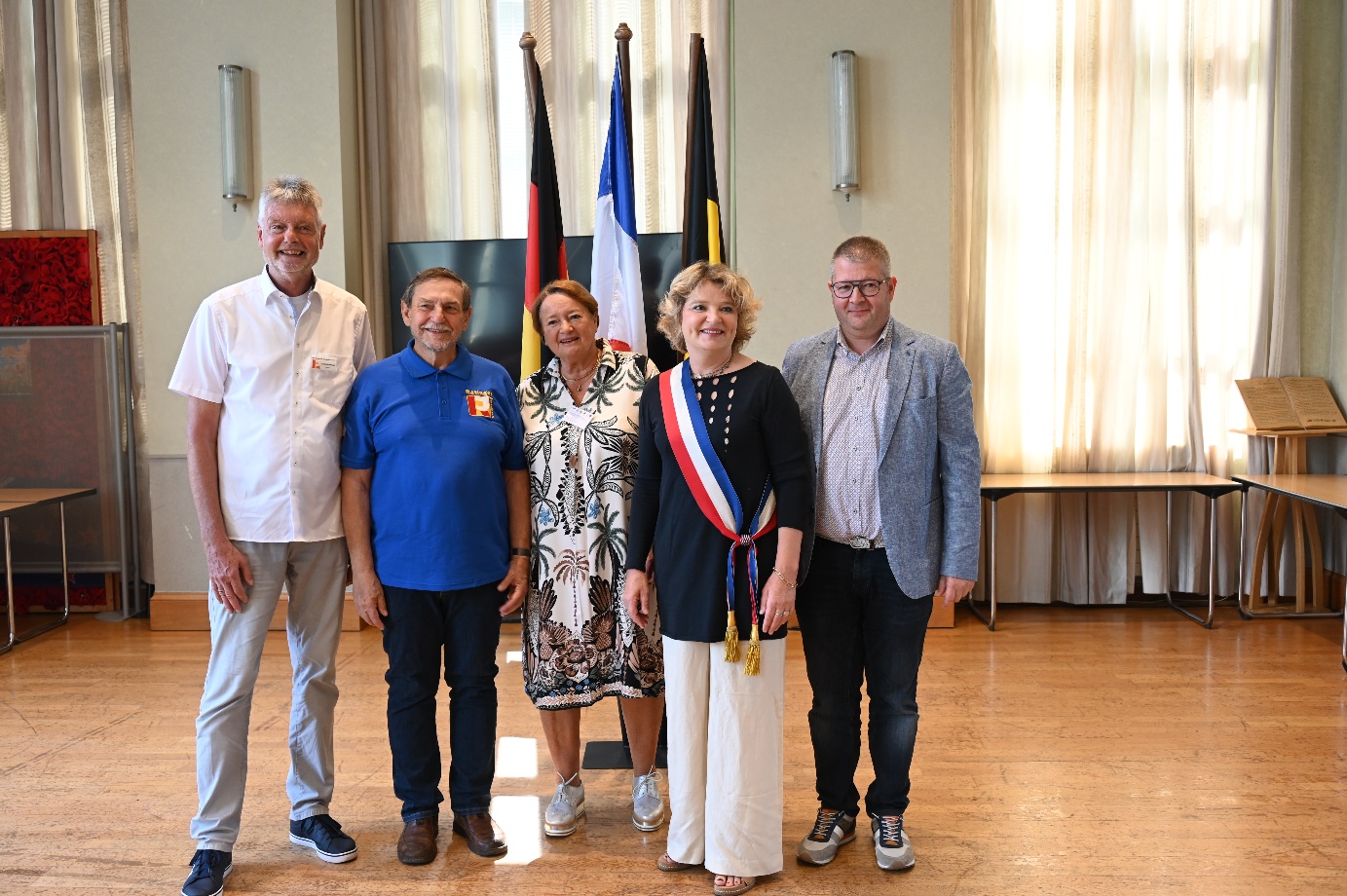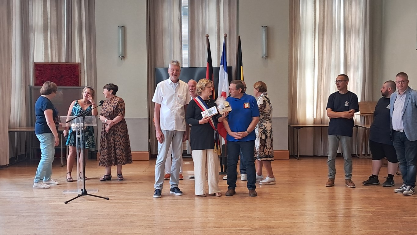 Aber jetzt von Anfang an: Im strömenden Regen ging es am Samstagmorgen los. Doch der Reisebaas, Norbert Halverkamps, hatte auch den Wettergott eingeladen und so konnten die Schirme von der Ankunft bis zur Abreise geschlossen bleiben. Der erste Nachmittag versprach kurzweilige Stunden bei Flohmarkt, Kirmes sowie Stadt- und Bastionserkundung unter der Leitung von Marie-Lise Bridelance und Alain Depelsenaire vom Komitee der Städtepartnerschaften. Der Sonntag startete mit einem Empfang und Umtrunk im Rathaus. Die Bürgermeisterin, Marie-Sophie Lesne, begrüßte neben den Ratinger Jonges auch eine Gruppe aus der belgischen Partnerstadt Morlanwelz, angeführt von ihrem stellvertretenden Bürgermeister.