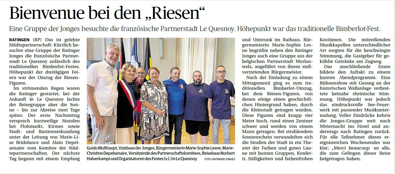 Am ersten Augustwochenende besuchte eine Gruppe der Ratinger Jonges die französische Partnerstadt Le Quesnoy. Höhepunkt war der Umzug der Riesen-Figuren anlässlich des Bimberlot-Festes.