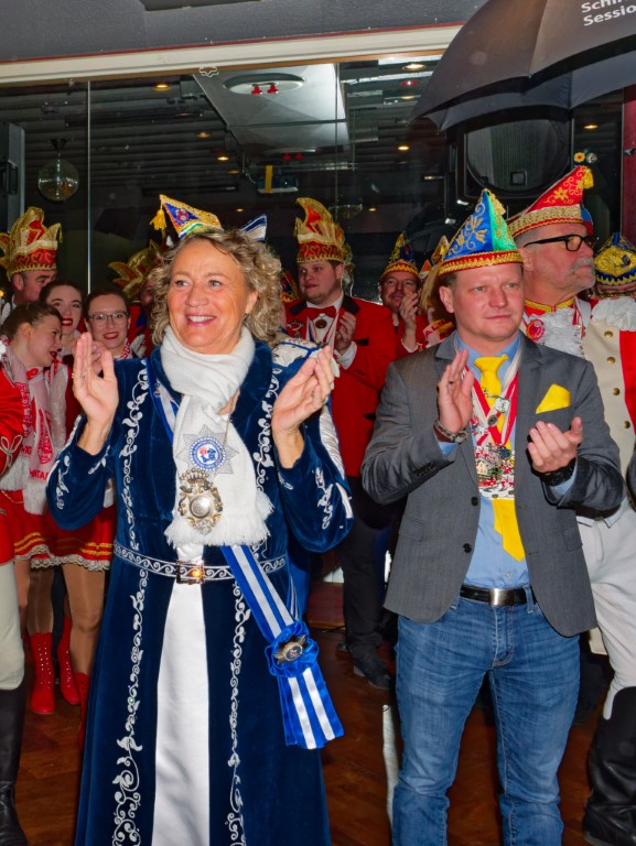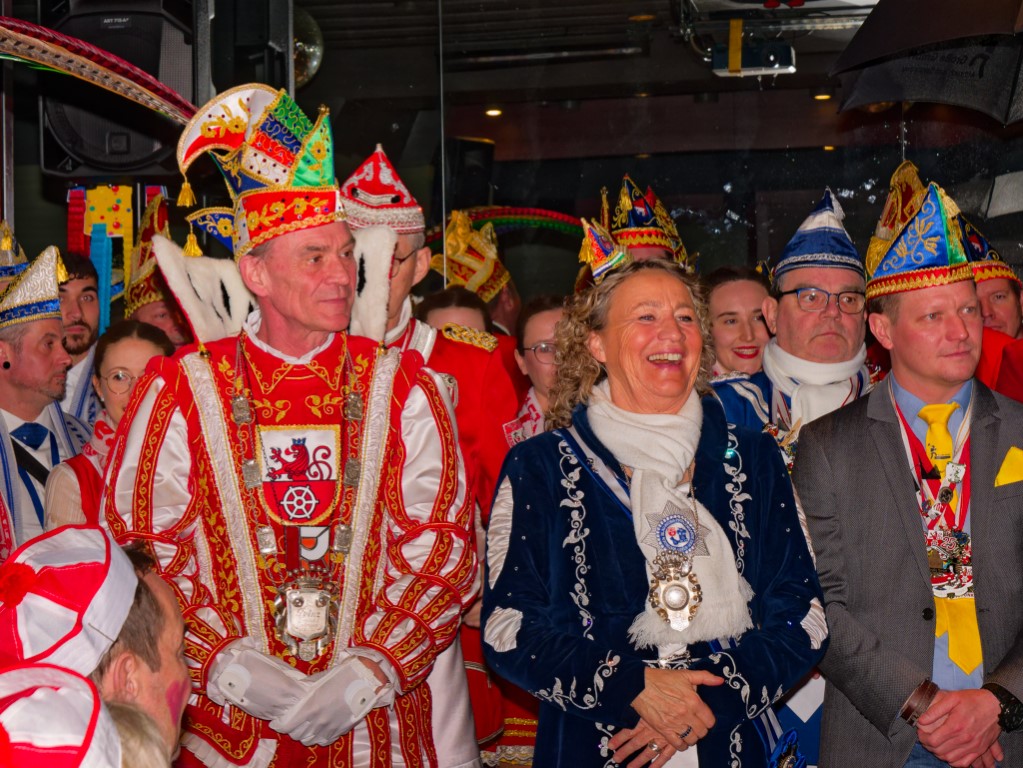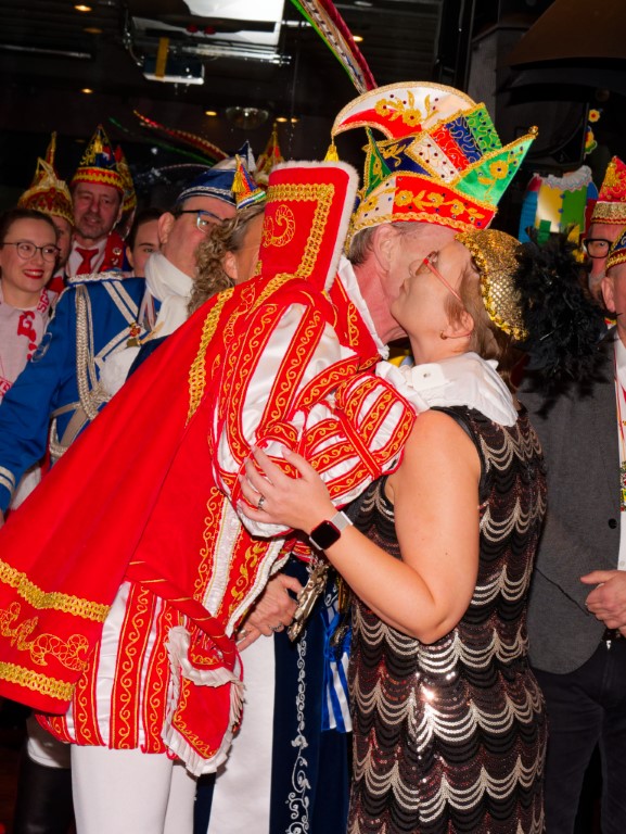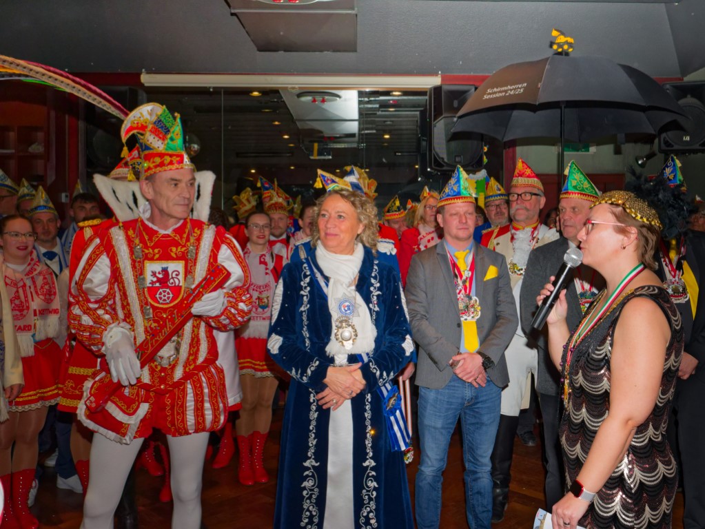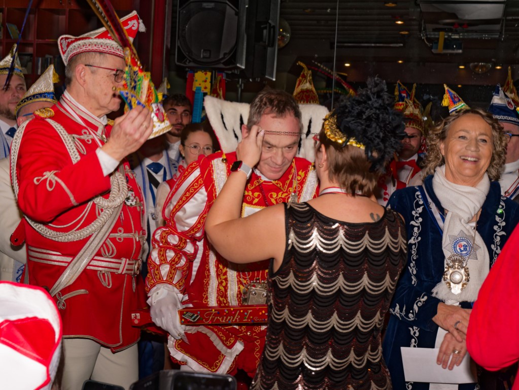 Der Besuch des Ratinger Prinzenpaares Frank und Sabine mischte den Saal nochmal richtig auf. Zu bemerken ist, dass Prinz Frank seit kurzem Mitglied der Ratinger Jonges ist. Es wurden sowohl Orden vom Prinzenpaar, dem Karnevalsausschuss und den Schirmherren an im Saal Anwesende aufgrund unterschiedlicher Verdienste verteilt, aber auch der berühmte Jonges-Orden an den Prinzen ausgegeben.